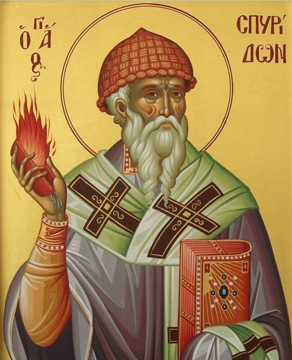 На светом Првом Васељенском сабору свети оци вођаху дуге спорове о Једноме Богу у Светој Тројици. Да би показао Јединство Свете Тројице свети Спиридон учини ово: узе циглу, стисну је, и из цигле изиђе огањ увис, вода наниже, а блато остаде у руци. И рече светитељ: Ето три стихије а једна цигла. Тако је и у Светој Тројици: три Лица а један Бог.