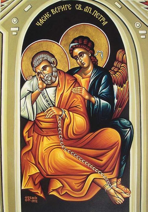 Када Ирод баци у тамницу апостола Петра, апостол би окован у двоје вериге. А када ноћу апостол спаваше међу двојицом војника, анђео Господњи куцну Петра у ребра, пробуди га и изведе. И са њега спадоше вериге, као што о томе пише у Делима апостолским (12, 4-7).