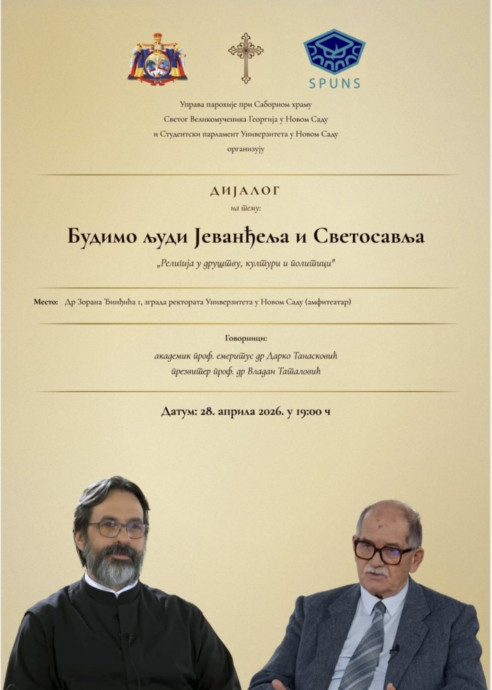 Управа парохије при Саборном храму Светог великомученика Георгија у Новом Саду и Студентски парламент Универзитета у Новом Саду организују 28. априла 2026. године са почетком у 19 часова дијалог на тему Будимо људи Јеванђеља и Светосавља - религија у друштву, култури и политици.