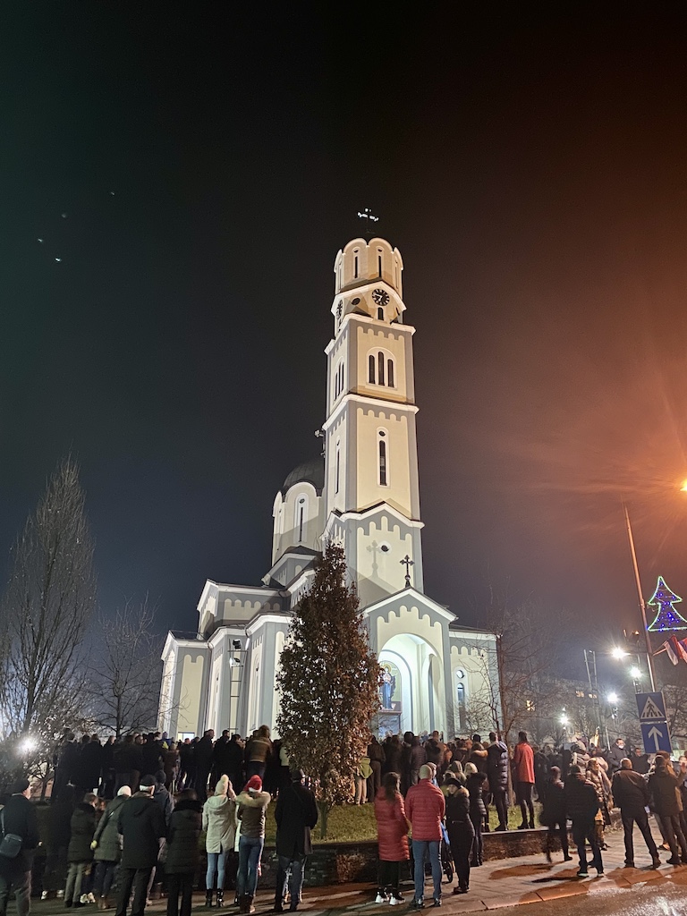Прослављање најрадоснијег хришћанског празника, празника мира, љубави и праштања, у Саборном храму Успења Пресвете Богородице у Дервенти отпочело је вечерњим богослужењем и налагањем бадњака у 18 часова. Божићна Литургија је служена у 5 часова.