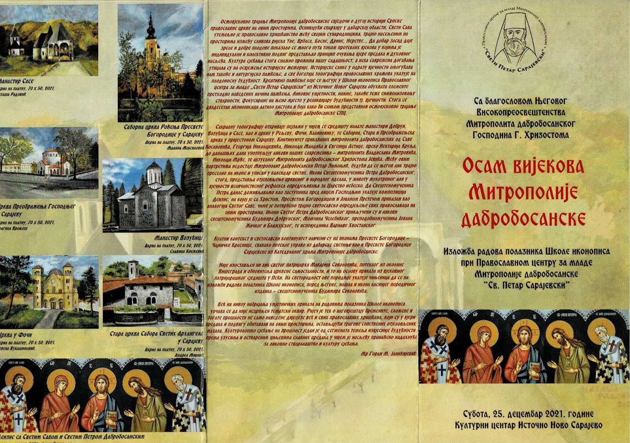 Са благословом Његовог Високопреосвештенства Митрополита дабробосанског г. Хризостома, у Културном центру Источно Ново Сарајево 25. децембра 2021. године отворена је изложба Школе иконописа при Православном центру за младе Митрополије дабробосанске Свети Петар Сарајевски.