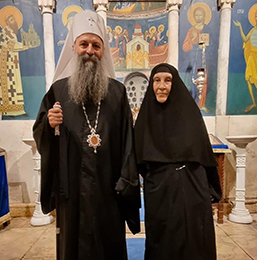 -Ево нас опет, опет смо дошли кући. Да Бог да да увек будемо овде и да све што мислимо, говоримо и чинимо има свој корен овде. Будући да је тај корен овде веома дубок, то значи да без обзира на олује, громове, муње и ветрове, нећемо се сломити. Ако нам корен није овде, ма где били и ма шта имали и ма какву моћ привремено изгледало да носимо у себи, све то је замалена и краткотрајно. Нека Бог да да заиста овде корен буде онима који су крштени у име Оца и Сина и Светог Духа, а део су наше Цркве. Нека Господ благослови Вас, мати и монахиње, вас које заливате тај корен, које окопавате тај корен. Kао што Господ каже, неко залива и неко окопова, а сви имамо од тога плодове који нас хране и који нас чувају и који од самог почетка, од Светог Саве, хранe нас и који ће нас, верујемо, увести у вечно Царство Сина Божјег који је дошао у свет, један од нас постао, пострадао, распет био, умро на крсту, али показао да последњу реч нема тама пролазности и тама смрти него светлост и радост Царствa небеског. Нека вас Господ све благослови, Вас мати и све сестре, а и све нас заједно са вама и Вашим молитвама и вашим подвизима. Христос воскресе!