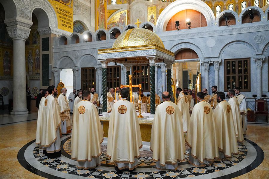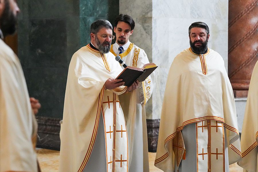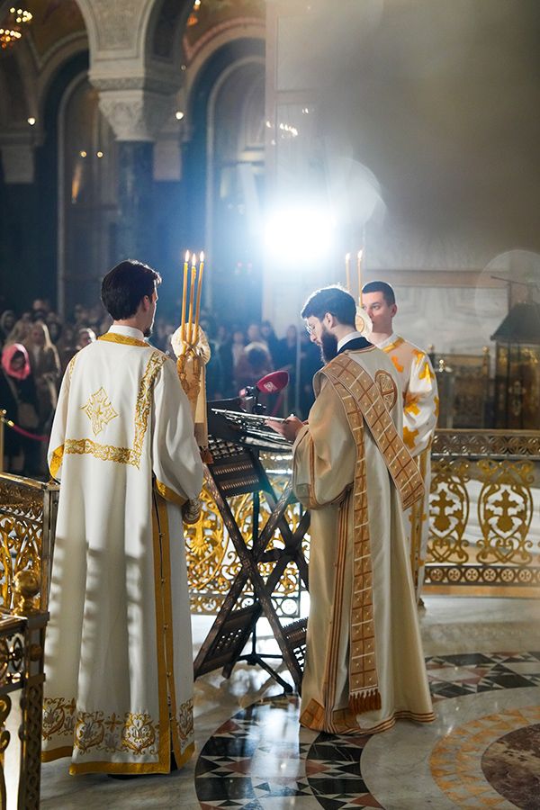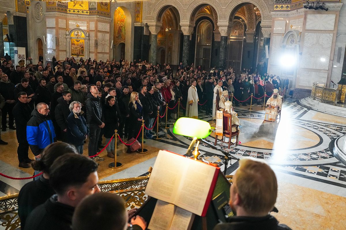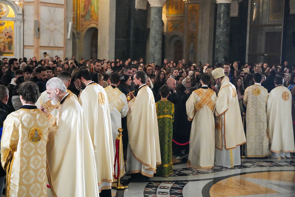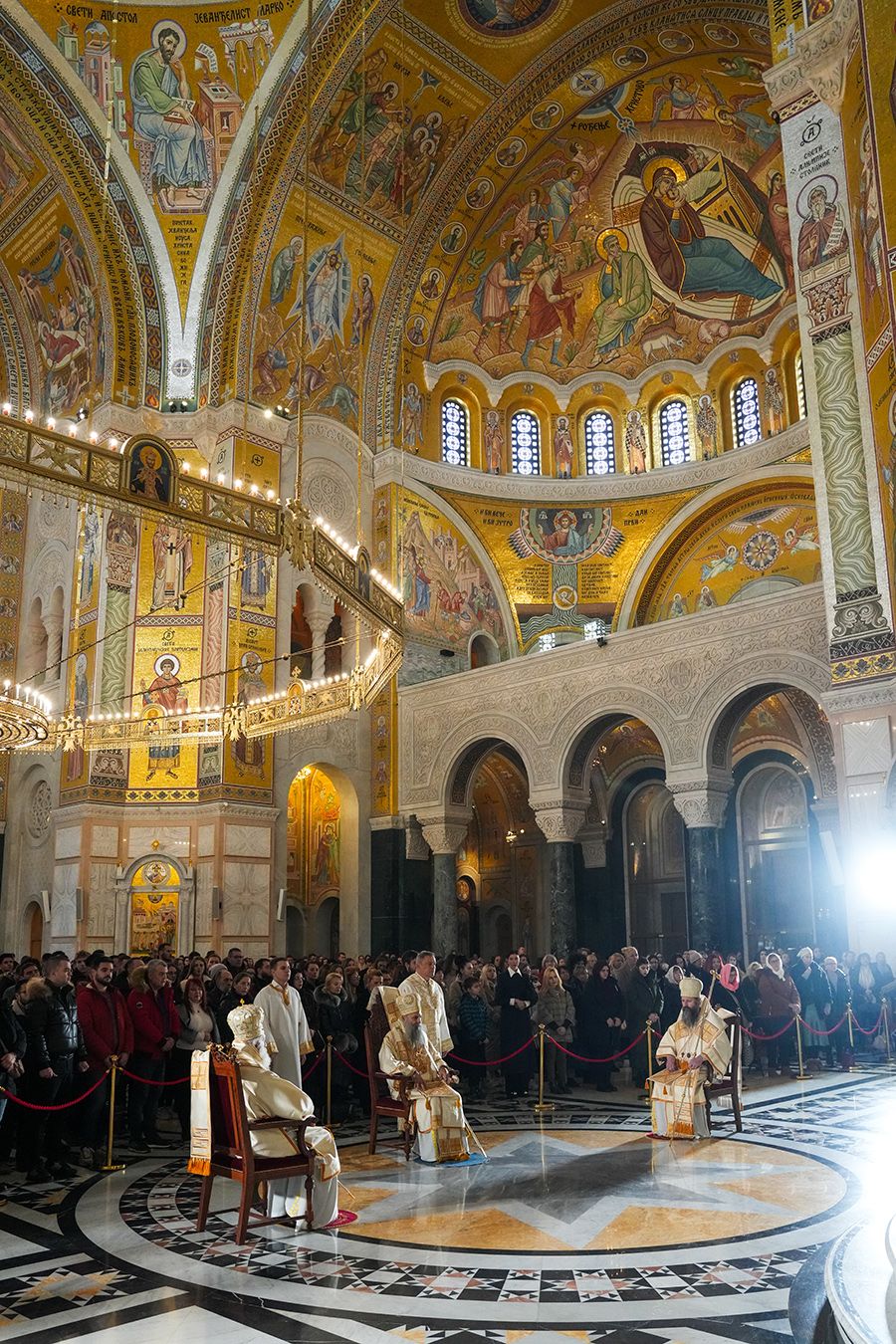 Његовој Светости Патријарху су саслуживали: преосвећена господа викарни епископи хвостански Алексеј и новобрдски Иларион; протојереј-ставрофор Радивоје Панић; протојереј Ђорђе Стојисављевић, шеф Кабинета Патријарх српског; протојереј-ставрофор Димитрије Касапис; протојереји Ненад Јовановић, Драган Шовљански, Иван Штрбачки и Бранислав Кличковић; јереји Далибор Стојадиновић, Дарко Николић, Бранислав Кеџић и Немања Калем; протођакони Драган Радић, Радомир Врућинић и Младен Ковачевић; и ђакони Василије Перић, Марко Поповић, Бранко Гогић, Никола Рашковић и Вук Ерцег.