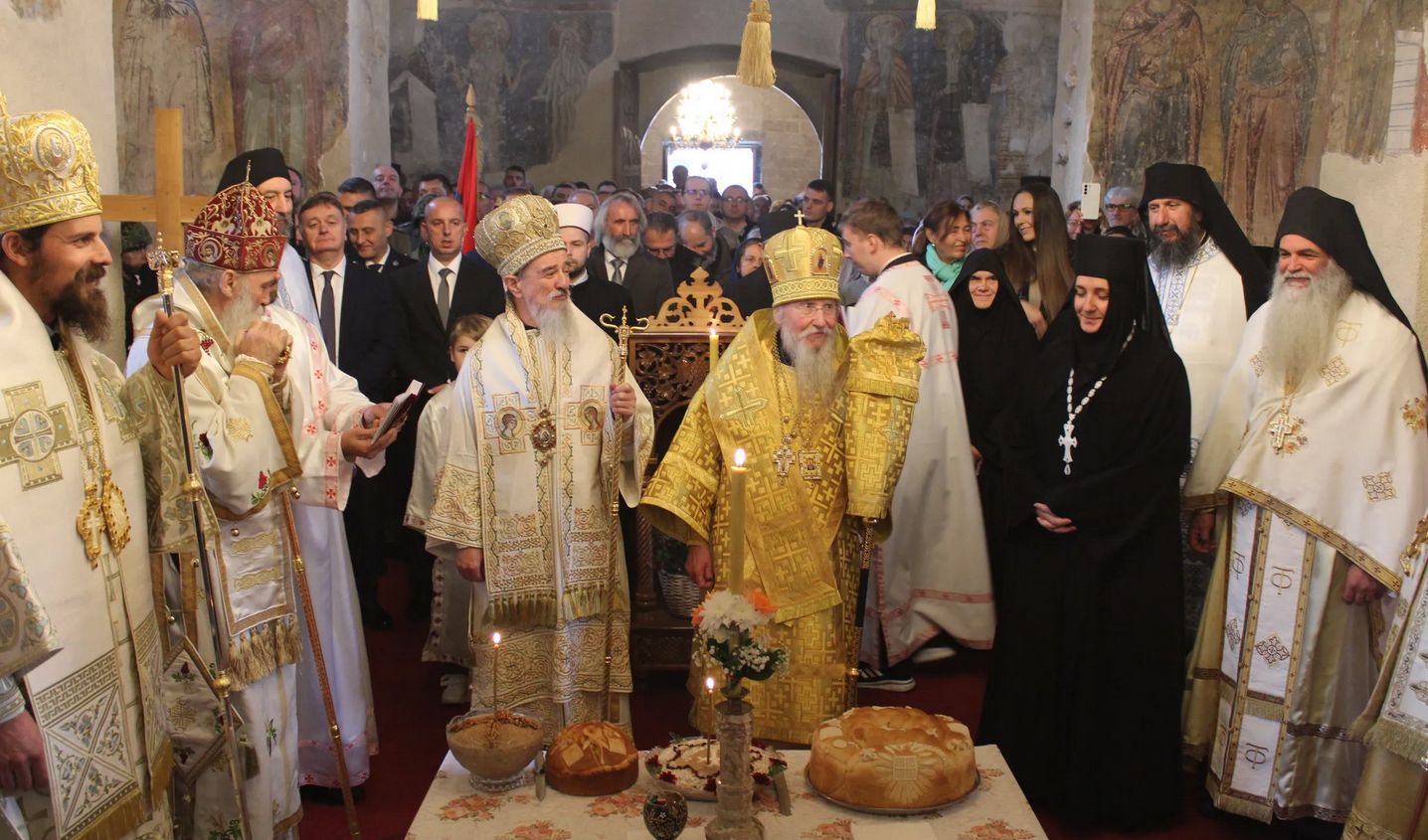После заамвоне молитве освештани су славски дарови које је припремило сестринство манастира Милешеве предвођено игуманијом Аквилином. По завршеној Божанској Литургији, високопреосвећене и преосвећене архијереје, свештенослужитеље и верујући народ поздравио је домаћин, Митрополит милешевски г. Атанасије: – Црква убедљиво пројављује своје најосновније особине. Она показује убедљиво да је Једна, Христова, Света, Саборна, Васељенска, Непобедива, Вечна, Животворна. Ове године је 1700 година од одржавања Првог Васељенског Сабора и 850 година од рођења Светог Саве. Тај Први Васељенски Сабор је значајан по томе што нам је дао Символ вере који ми и дан данас читамо на Божанској Литургији, на најсветијој служби. То је наша умна, духовна застава. Позивам вас да чешће у току дана читамо текст Символа вере, обраћајући и ум и срце Богу.