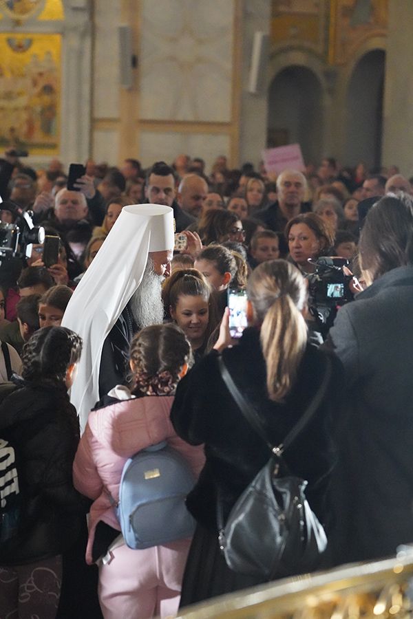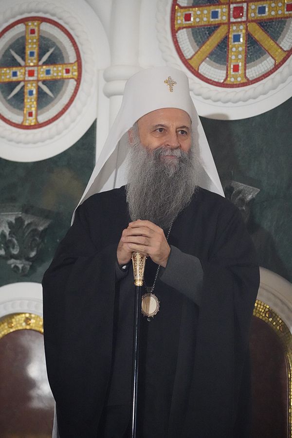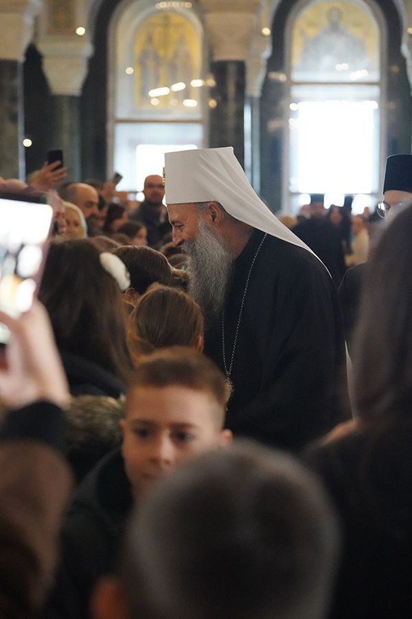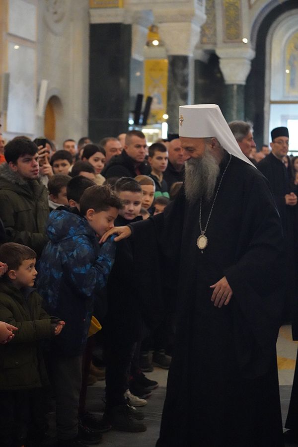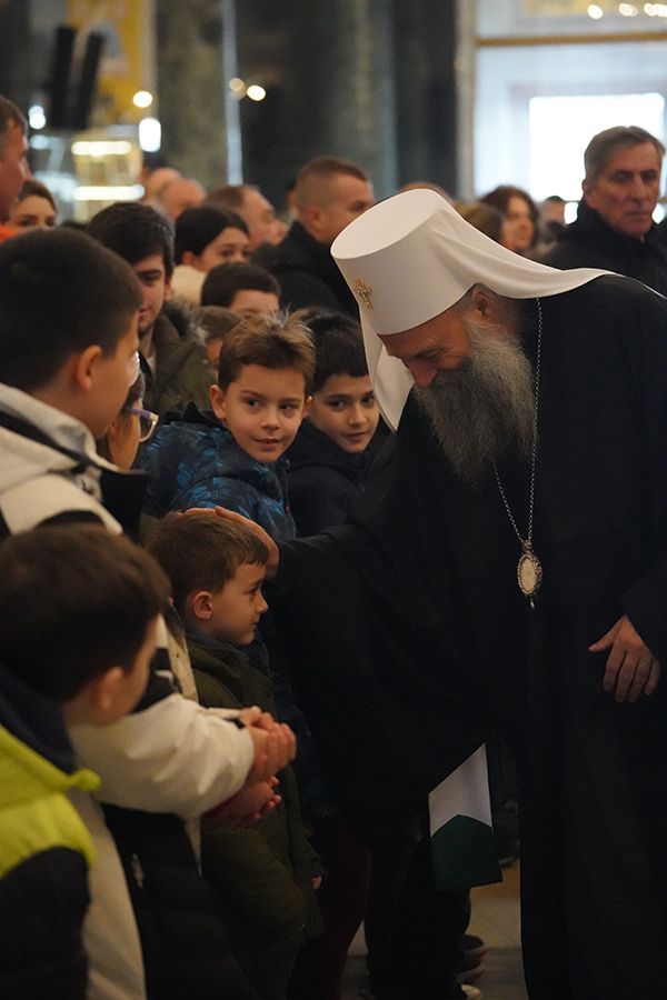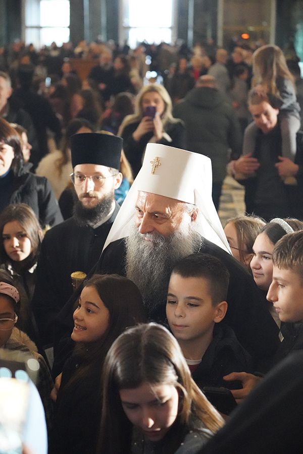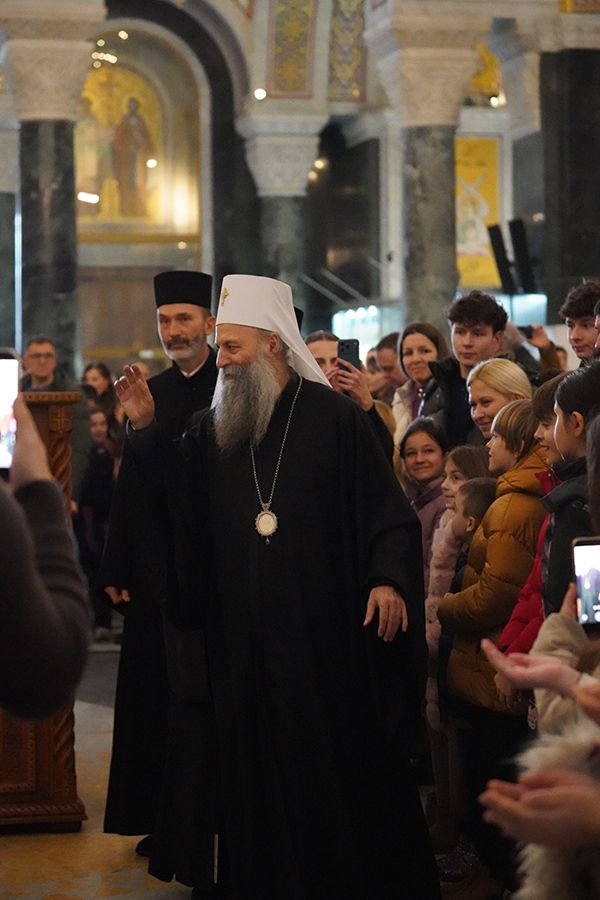 На крају празничног програма, Његова Светост Патријарх српски г. Порфирије је ученицима честитао празник Светог Саве, првог Архиепископа српског, и упутио им очинску беседу:
