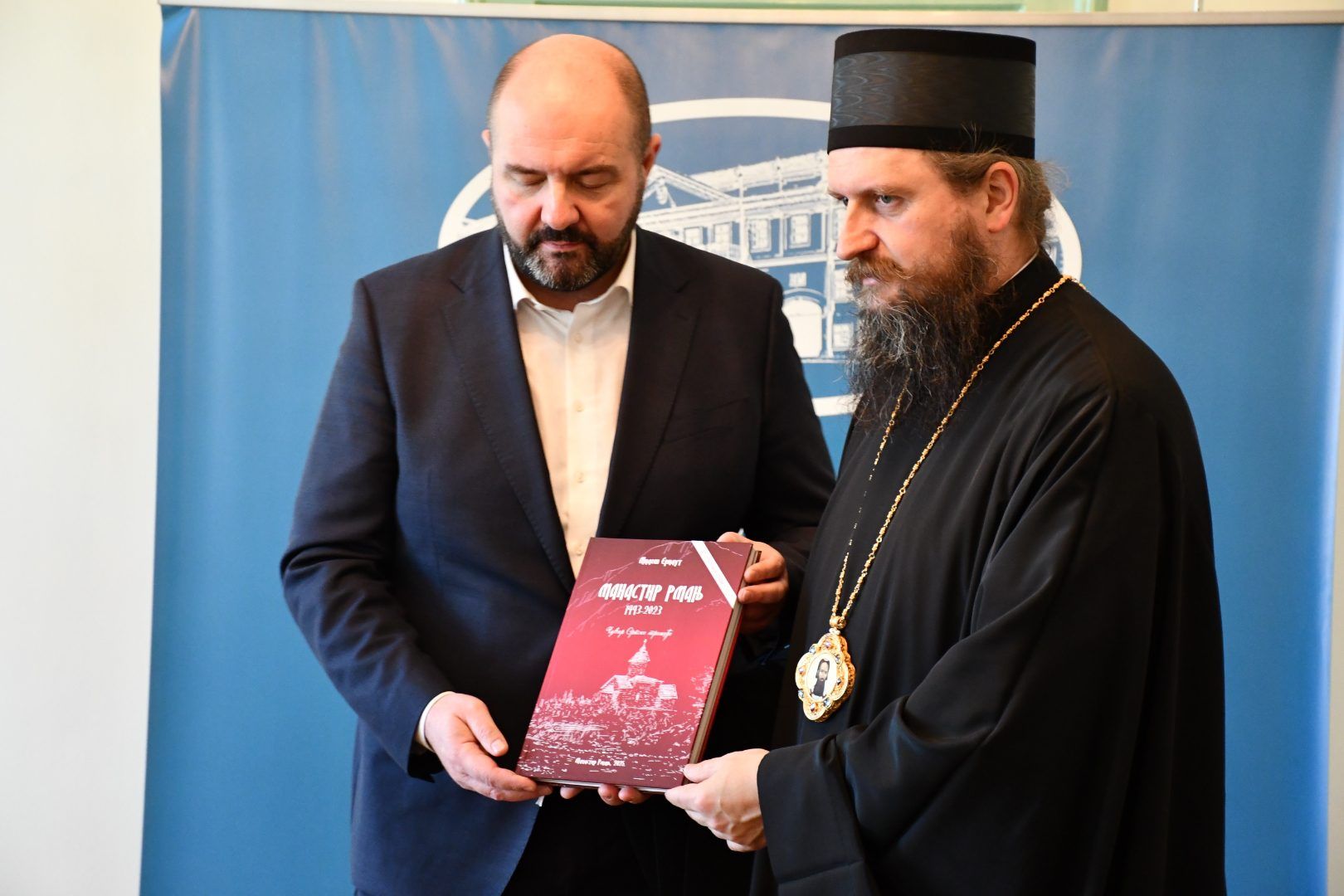 Владика је срдачно поздравио г. Ђурђића, дугогодишњег пријатеља Епархије бихаћко-петровачке, захваливши му на доброј сарадњи са жељом да се она настави у будућности. Такође Епископ је говорио о историји Епархије бихаћко-петровачке и Светониколајевске свештене обитељи манастира Рмња кроз векове. Председник Општине Сремски Карловци је упознао владику Сергија са својом добром вољом за наставком сарадње са Епархијом бихаћко-петровачком.