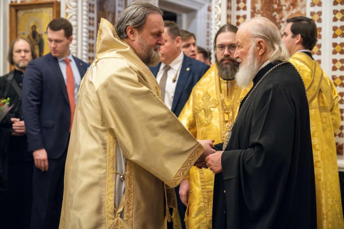 По окончању Литургије, Митрополит воскресенски г. Григорије је прочитао поздравно слово чланова Светог Синода Руске Православне Цркве упућено Његовој Светости Патријарху г. Кирилу са честиткама поводом седамнаесте годишњице устоличења. На дар Његовој Светости, Митрополит је предао икону Мајке Божје Одигитрије. Уследиле су поздравне речи и уручење црквених награда. Окупљенима се архипастирском беседом обратио и Његова Светост Патријарх г. Кирило, призивајући на све благослов Господњи.