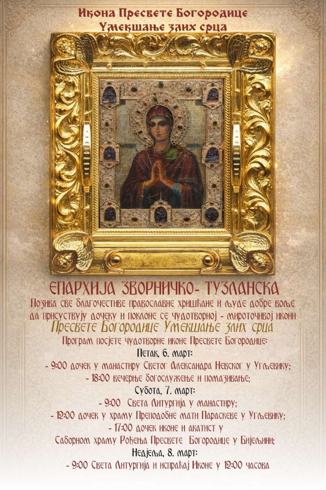 Долазак ове светиње представља изузетан духовни догађај будући да је икона Пресвете Богородице „Умекшање злих срца“ широм православног света позната по бројним чудима, исцељењима и мироточењу. Њено молитвено присуство позива на преумљење, праштање, измирење и ублажавање мржње и злобе у људским срцима. Према утврђеном програму, дочек чудотворне иконе обавиће се у петак, 6. марта 2026. године, у 9 часова у манастиру Светог Александра Невског у Угљевику, где ће бити служено вечерње богослужење и обављено помазивање верних. У суботу, 7. марта, света Литургија биће служена у манастиру, после чега ће икона бити дочекана у храму Преподобне мати Параскеве у Угљевику, а затим, у поподневним часовима, и у Саборном храму Рођења Пресвете Богородице у Бијељини, где ће бити служен акатист Пресветој Богородици. У недељу, 8. марта, верни народ ће имати прилику да присуствује светој Литургији, после које ће бити обављен испраћај чудотворне иконе.