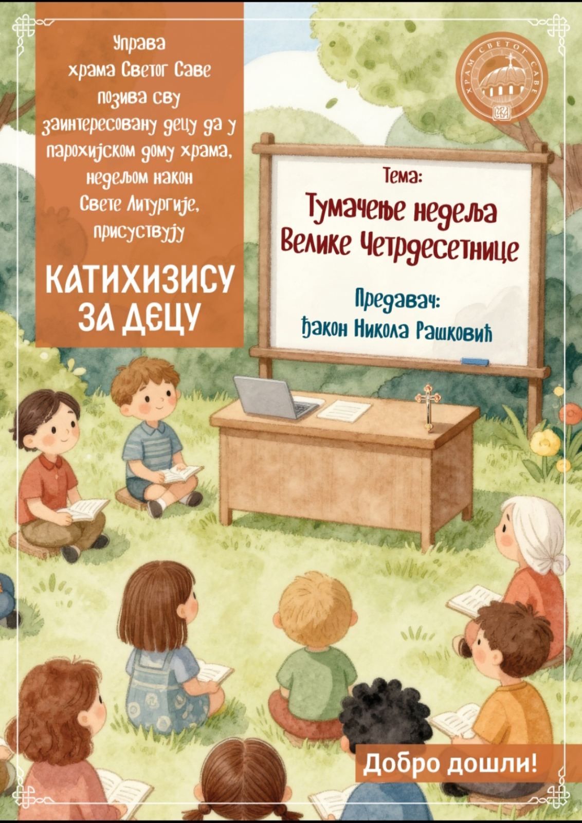 Братство храма Светог Саве са радошћу позива верни народ и сву заинтересовану децу да узму учешће у предстојећим циклусима предавања верске наставе. Ови сусрети ће се одржавати у просторијама парохијског дома са циљем упознавања са различитим темама из катихизиса и живота Цркве.