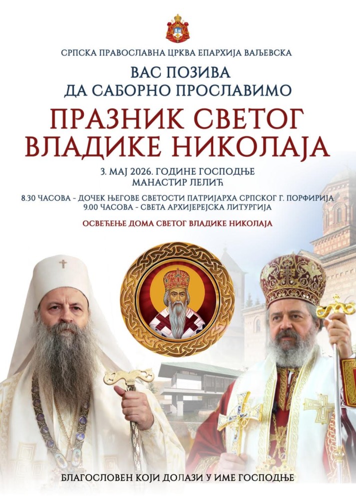 Епархија ваљевска позива верни народ на саборну прославу празника Светог владике Николаја 3. маја 2026. године у манастиру Лелић.