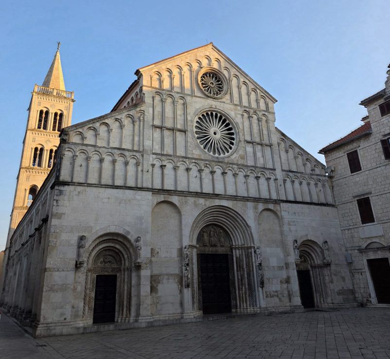 Епископа и његову пратњу испред цркве Светог Симеона Богопримца у Задру срдачно је дочекао дон Дамир Шехић, који је упознао епископа Сергија са историјом храма и града и са битном чињеницом да се тренутно на моштима Светог Симеона Богопримца налази покров, дар деспота Ђурђа Бранковића који је везен руком Катарине Кантакузине, ктитора манастира Рмња, која је у истом стилу веза са митром коју је везла управо Катарина Кантакузина.