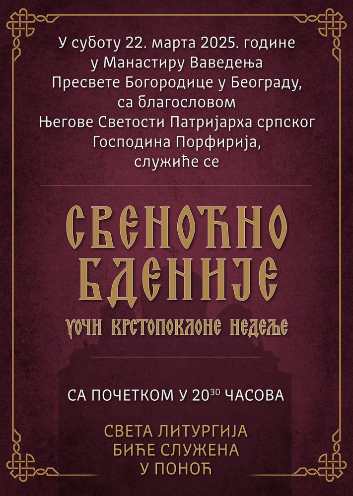 Свеноћно бденије у манастиру Ваведења Пресвете Богородице у Београду