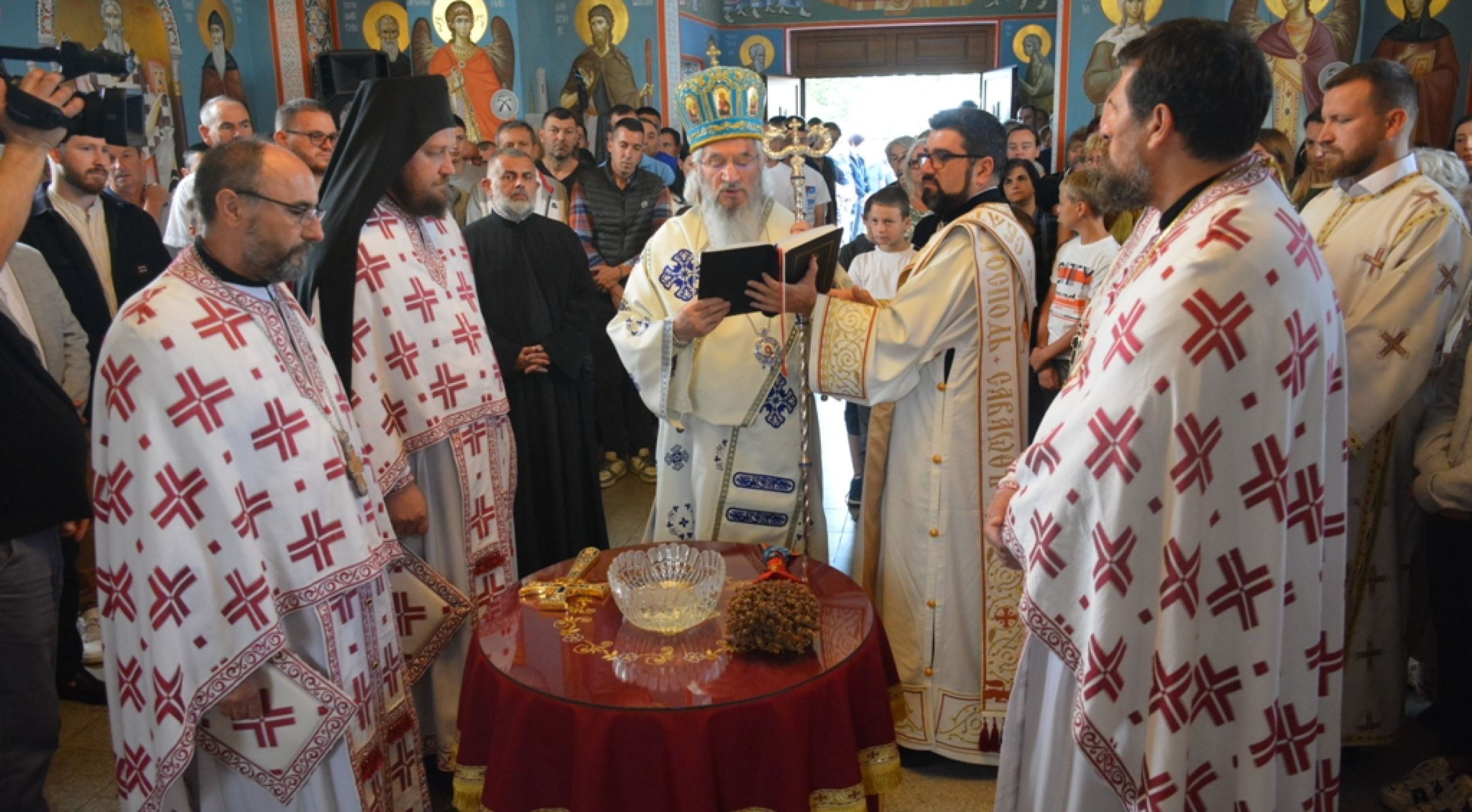 - У име Оца и Сина и Светог Духа! Нека је благословено наше данашње сабрање у овом храму. Нека је срећно и благословено освећење нових фресака у њему. Када Цркву живопишемо и осликавамо не чинимо то зарад просте декорације. Ту на зидовима изображавамо ликове светитеља, почевши од Христа, Богородице и осталих светитеља. То радимо да би се подсетили да су људи који су осликани на фрескама били људи као и ми. Изнад свега су били хришћани. Слушали су реч Божју и испуњавали је. Када уђемо у цркву која је живописана, осећамо се као да смо на парчету Неба. Основно начело њиховог живота било је да угоде Богу и ближњима. Чули сте, приликом освећења фресака, да припадамо светитељима који су изображени како би се они молили за нас, да разгоне таму, да лече болесне, да буду пример нама. И они су као људи носили тело, али су ипак постали свети. Испуњавали су заповести Божје, а поготово заповести о љубави које нам Господ даје, да љубимо Бога свим умом, срцем, душом и снагом својом и да љубимо ближње као себе саме. Светитељи са фресака и икона се радују када виде мноштво народа на служби, а тужни су када се Литургија служи без народа Божјег – беседио је митрополит ЈОван.