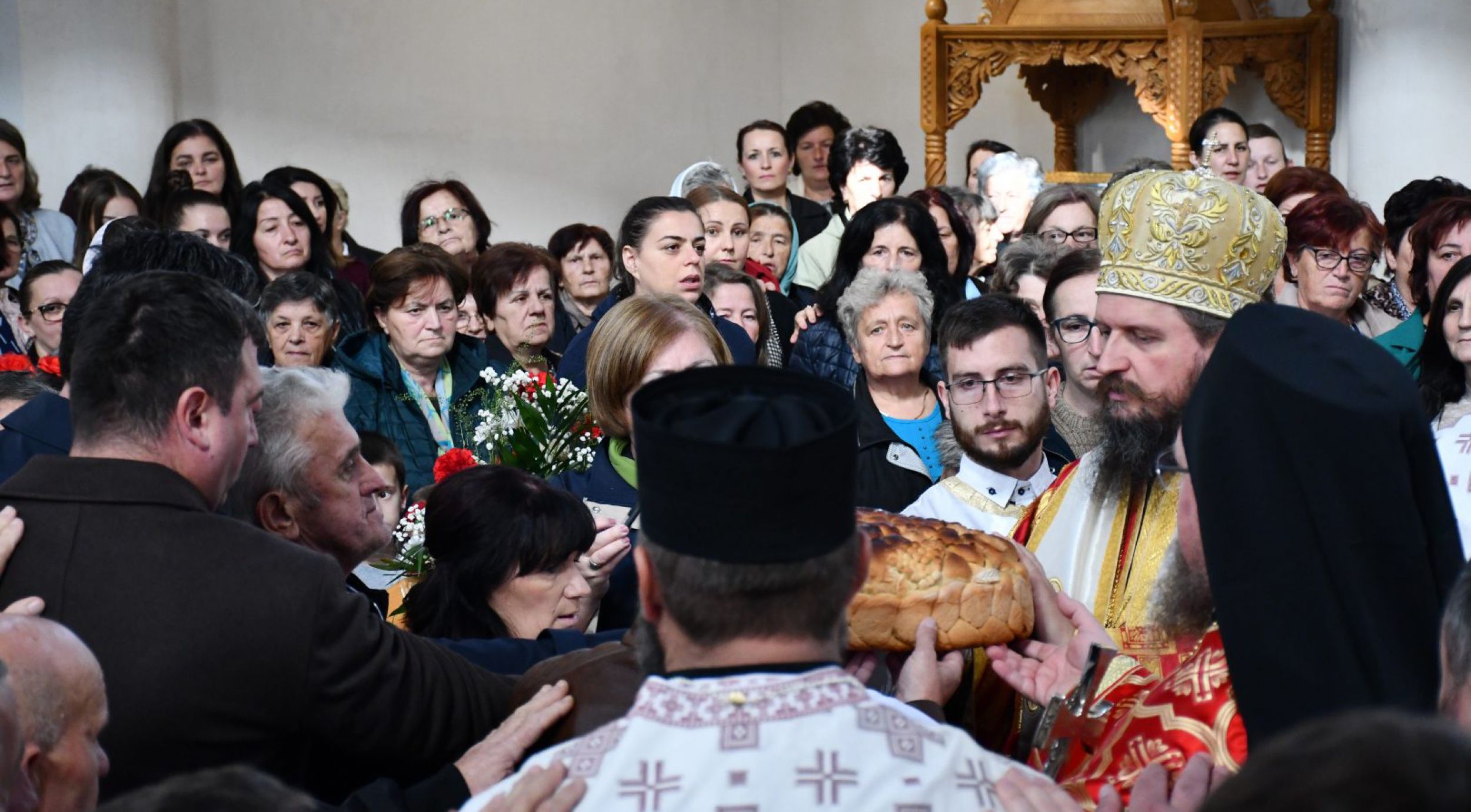 Испред храма заједно са верним народом епископа Сергија је дочекао протопрезвитер Александар Ђурић. Његовом Преосвештенству су саслуживали: архимандрит Варнава (Дамјановић); протопрезвитери-ставрофори Мирослав Гаврић, Никола Пено и Бошко Максимовић; и протођакон Немања Рељић. Након заамвоне молитве извршено је благосиљање славских дарова које су принели свечари храма Покрова Пресвете Богородице г. Раденко и гђа Анка Солдат.