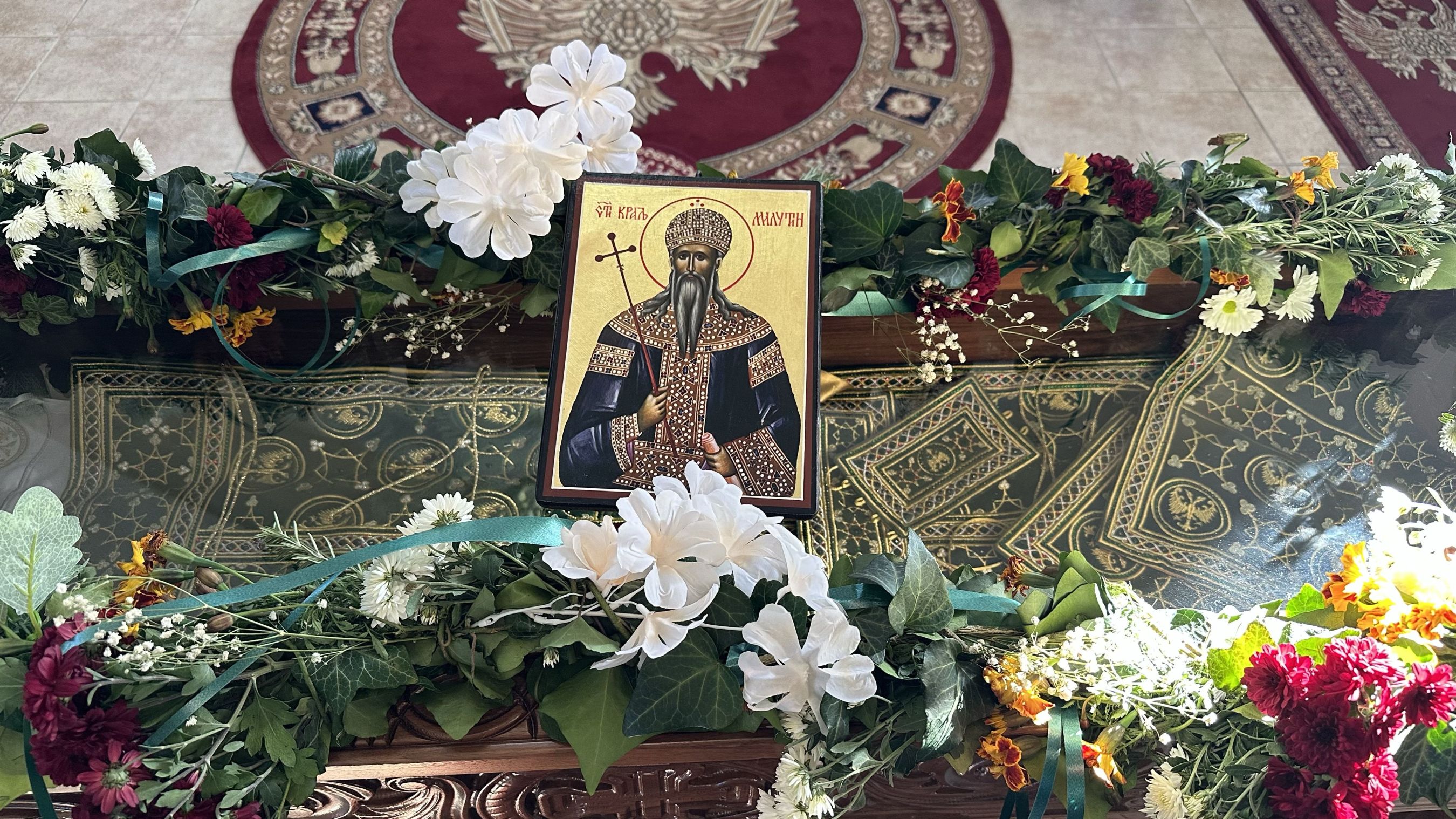 „Данас се молитвено сећамо Светог краља Милутина, иако се он не слави на данашњи дан, а разлог томе је што су овде, у храм Светог Симеона Столпника у Милошевцу, донете свете одежде које су биле на њему. Из најстарије хришћанске традиције знамо да где су предмети и одећа везани за светитеља, да је тамо и сам тај светитељ присутан. Још из најстаријих времена видимо велико поштовање према плаштаници у којој је био увијен наш Господ Исус Христос, као и велико поштовање појаса Пресвете Богородице, али и убруса којима се брисао апостол Павле, а који имају ицељујуће дејство на оне који су им прилазили вером. Такође, и дан данас у цркви Светог Петра у Риму се чувају вериге у којима је био окован апостол Петар. Предмете који су били везани за светитеље, особито они предмети и одежде које су његово тело додиривали, ми поштујемо јер по учењу наше свете Цркве благодат Божија која на свакој светој Литургији силази на све нас и свете дарова, на хлеб и вино који постају Тело и Крв Христова, та благодат Божија прожима душе светитеља и њихово само тело бива прожето благодаћу Божијом, подражавајући будуће наше тело након Васкрсења. Због тога тела светитеља не труну као код обичних грешних људи, него прожета овом божанском благодаћу остају нераспаднута и изливају благопријатни мирис. Тако су и мошти Светог краља Милутина нетрулежне и налазе се данас у Софији, у храму Свете Недеље, и благочестивошћу вашег сународника, нашег брата Жељка Јовића, који је једно време по службеној дужности боравио у Софији као представник наше државе, донете су нам одежда Светог краља Милутина, у којима су у протеклу годину дана биле обучене мошти Светог краља Милутина, као уздарје нашој епархији и његовом селу. Кроз овај драгоцени дар, Свети краљ Милутин нам је постао свакодневно присутан“ – беседио је владика Јеротеј.