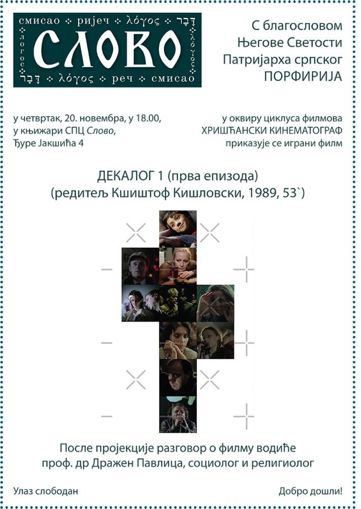 С благословом Његове Светости Патријарха српског г. Порфирија, у четвртак, 17. новембра 2025. године, са почетком у 18 часова у књижари Српске Православне Цркве Слово (ул. Ђуре Јакшића 4) у оквиру циклуса филмова Хришћански кинематограф биће приказан играни филм Декалог 1 (прва епизода) редитеља Кшиштофа Кишловског (1989, 53`). После пројекције разговор о филму водиће проф. др Дражен Павлица, социолог и религиолог. Добро дошли!