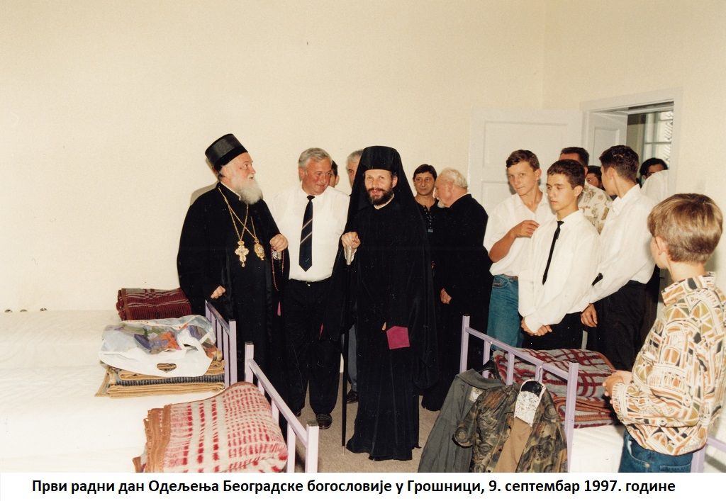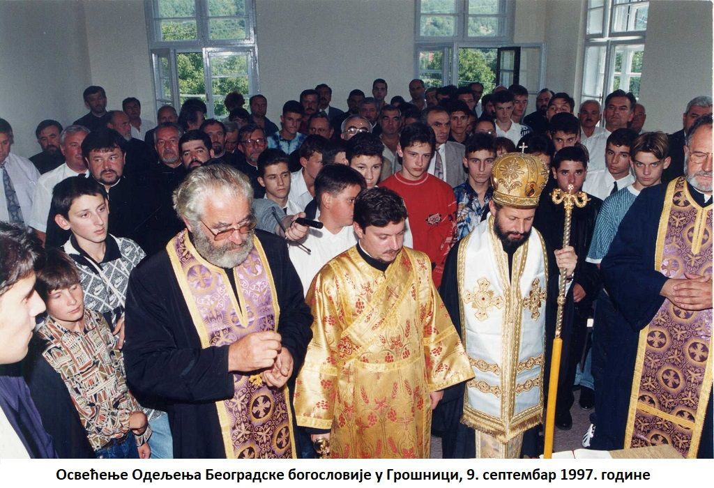 Проректор Одељења Београдске богословије у Грошници протојереј-ставрофор др Драган Протић, у то време професор Богословије и Богословског факултета у Београду, у чланку Допринос Епископа шумадијског др Саве унапређењу црквене просвете Српске Православне Цркве и оснивање Богословије у Крагујевцу пише: „Било је тешко спровести одлуку о оснивању Одељења. Није добио ни зграду ни простор у граду, иако су градске власти биле расположене да помогну. Међутим, неке друге, више власти, нису биле за то. Ипак, иако у тешким условима, нова Богословија је почела са радом у Задружном дому у Грошници код Крагујевца у септембру 1997. године као истурено одељење Богословије Светог Саве у Београду“.