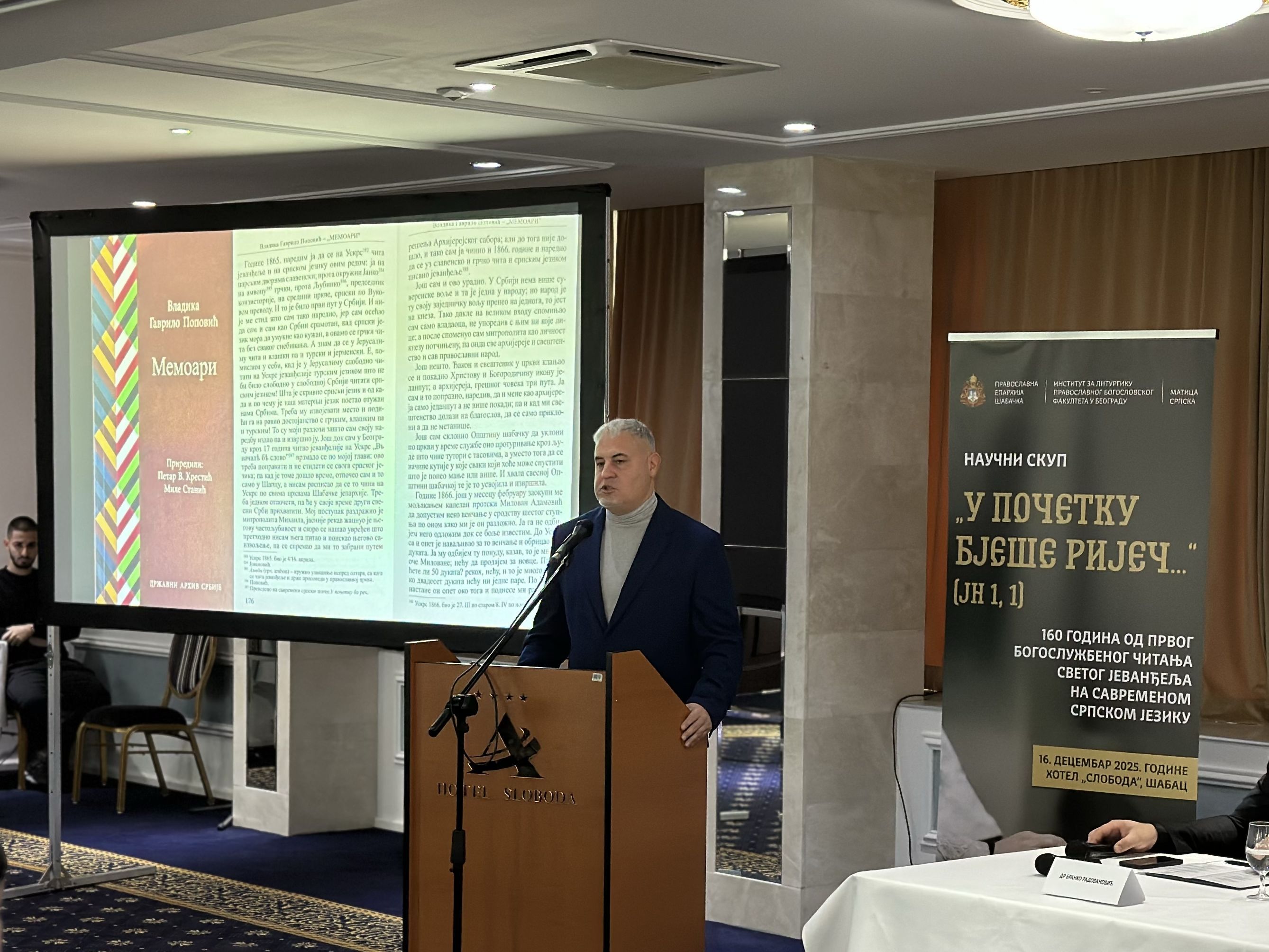 Епархија шабачка, поводом великог јубилеја – 160 година од првог богослужбеног читања Светог Јеванђеља на савременом српском језику, организовала је 16. децембра 2025. године у шабачком хотелу „Слобода“ научни скуп „У почетку бјеше ријеч...“ (Јн 1, 1).