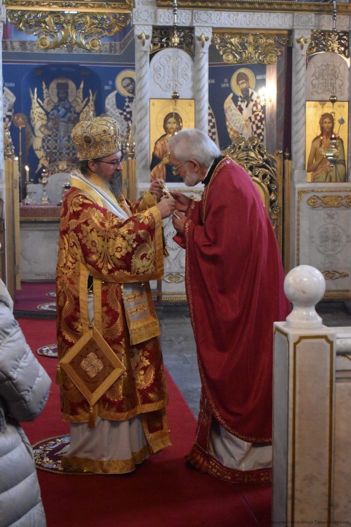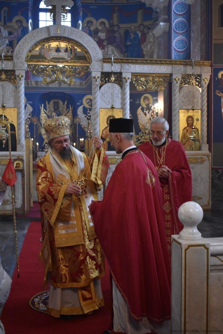 По заамвоној молитви освећени су славски дарови принети у славу Божју и у част Светог Николаја Мирлокијског, после чега се Високопреосвећени г. Герасим обратио верницима, честитавши новорукоположеном оцу Гедеону и пожелео Божји благослов и ревност у његовом будућем свештенослужењу.