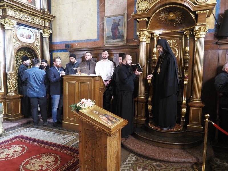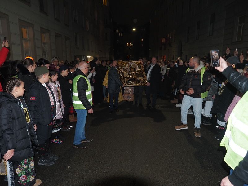 Вечерњем богослужењу и поклоњењу икони великог броја верника присуствовали су Његово Преосвештенство Епископ осечкопољски и барањски г. Херувим, Његово Преосвештенство Епископ мохачки и викар Митрополита бачког г. Дамаскин, високопреподобни игуман хиландарски архимандрит Методије и преподобни монаси те свете обитељи Дамаскин и Тома, ђакони и свештеници Епархије аустријске и Епархије бачке, као и представници верских заједница, дипломатског кора, државних и градских власти, културног и уметничког живота главног града Аустрије.