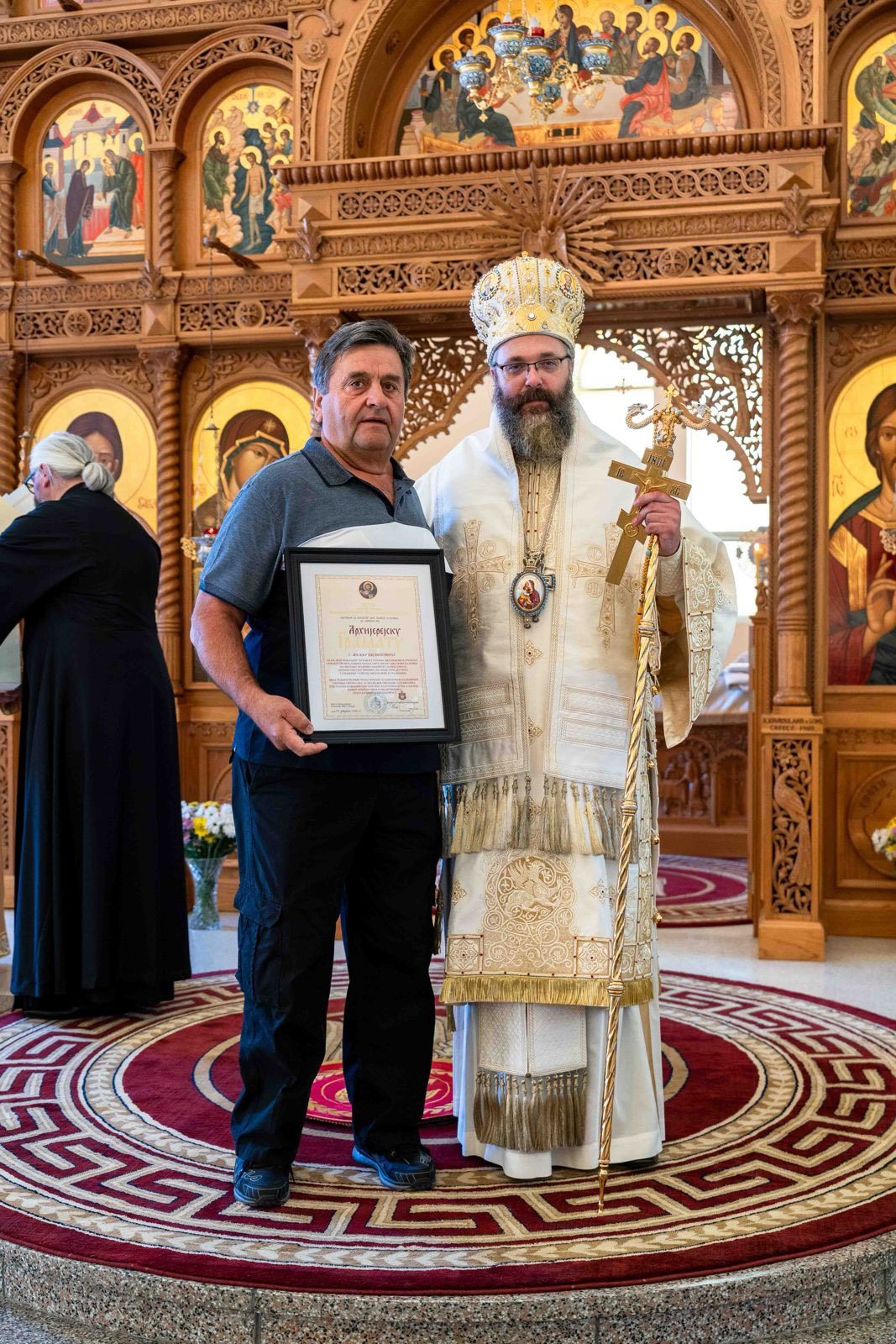 У подвигу и труду са онима којима је од стране Цркве поверено послушање и задужење да предводе обнову и даље организационо, и неопходно у условима манастирског живота, напредовање, исто је видљиво из године у годину, љубављу и трудом многих. Датим поретком, од стране архијереја препознати су путем грамате и захвалнице истакнути дарови и доприноси хришћанске љубави и светосавске вере. Међу њима је и јединствени дар породице Ковачевић из Мелбурна, украсни мозаик лика Светог Саве на порталу храма, у изради уметника неимара Ристе Вујиновића из Требиња. Мозаик је после литије освећен. Овогодишњи домаћин г. Ратко Миличевић је ранији дародавац троносне иконе Богородице Тројеручице и дугогодишњи добротвор, који је по освештаној традицији предао део колача наредним домаћинима из породице Пољчић и Шуваило из Кабрамате.