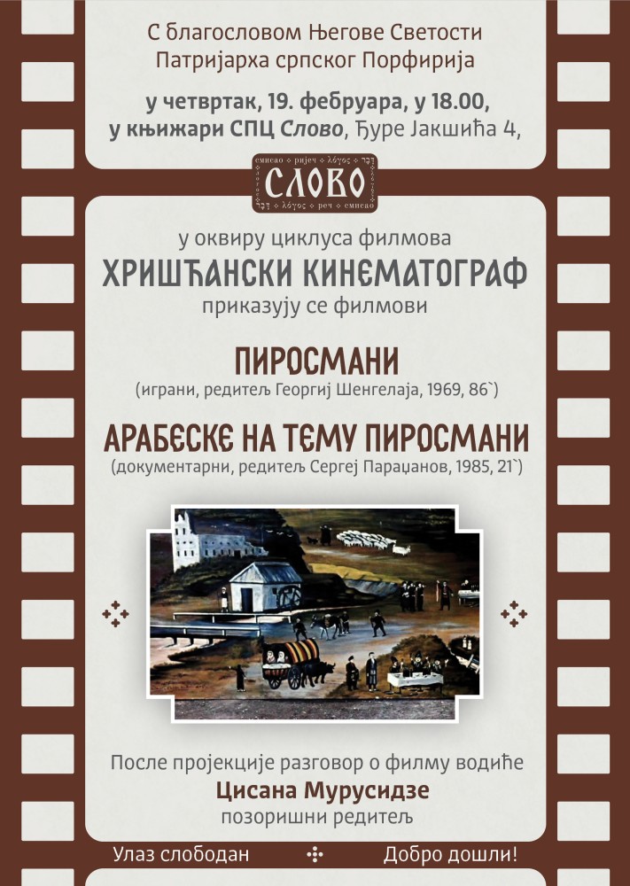 У четвртак, 19. фебруара 2026. године, са почетком у 18 часова, у оквиру циклуса филмова Хришћански кинематограф биће приказани играни филм „Пиросмани“ редитеља Георгија Шенгелаје (1969, 85`) и документарни филм „Арабеске на тему Пиросмани“ редитеља Сергеја Параџанова (1985, 26`).