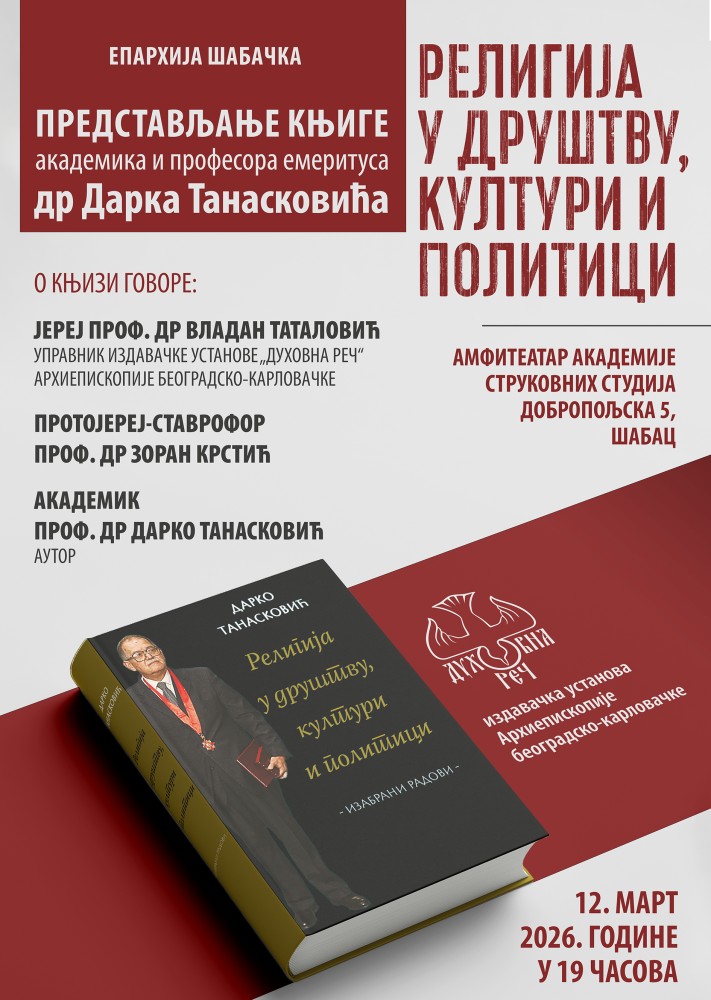 Са благословом Његовог Преосвештенства Епископа шабачког г. Јеротеја, у амфитеатру Академије струковних студија у Шапцу, 12. марта 2026. године са почетком у 19 часова биће представљена књига др Дарка Танасковића „Религија у друштву, култури и политици“.