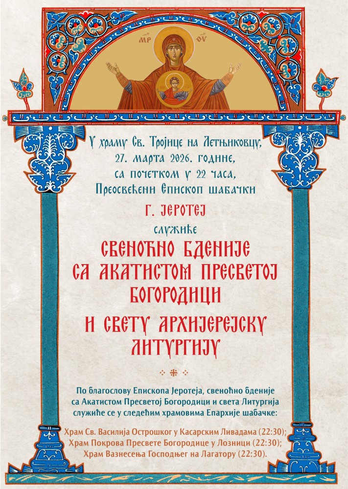 Епархија шабачка такође обавештава верни народ и да ће у среду пете недељу Великог поста, 24. марта 2026. године, у градским, приградским и храмовима у којима су седишта намесништава служити прво бденије са почетком у 17 часова.