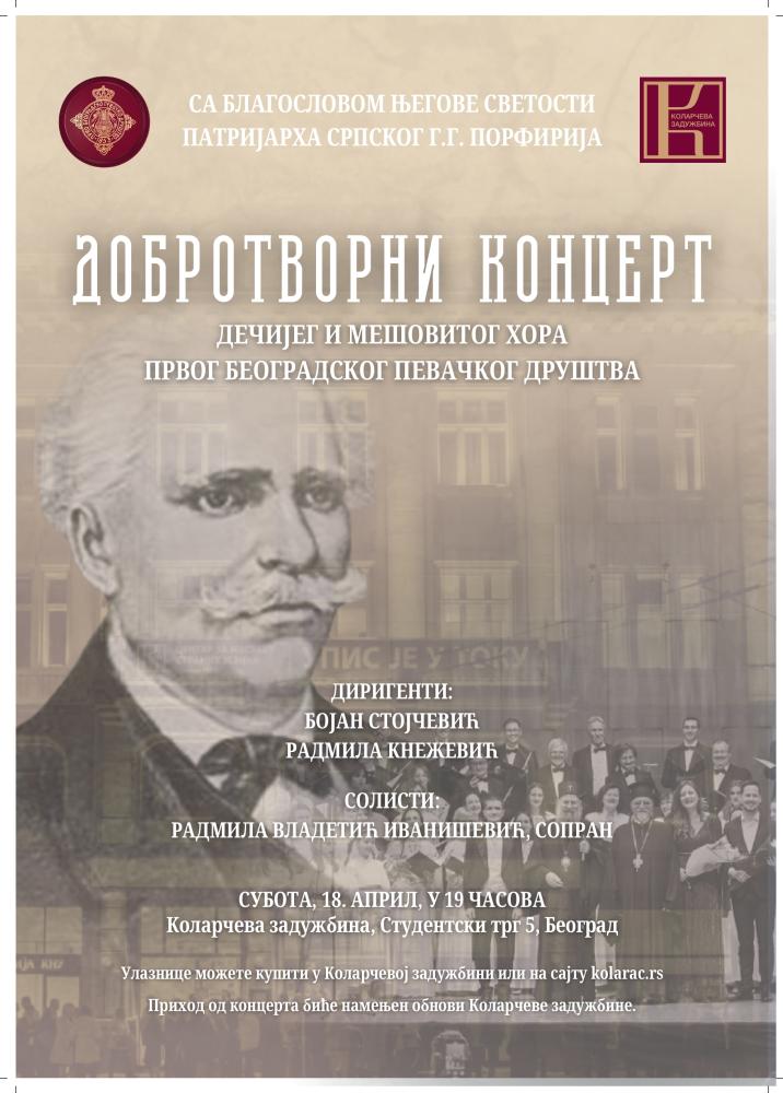 Са благословом Његове Светости Патријарха српског г. Порфирија, мешовити и дечји хор Првог београдског певачког друштва приредиће у суботу, 18. априла 2026. године, са почетком у 19 часова добротворни концерт посвећен обнови Задужбине Илије Милосављевића Коларца.