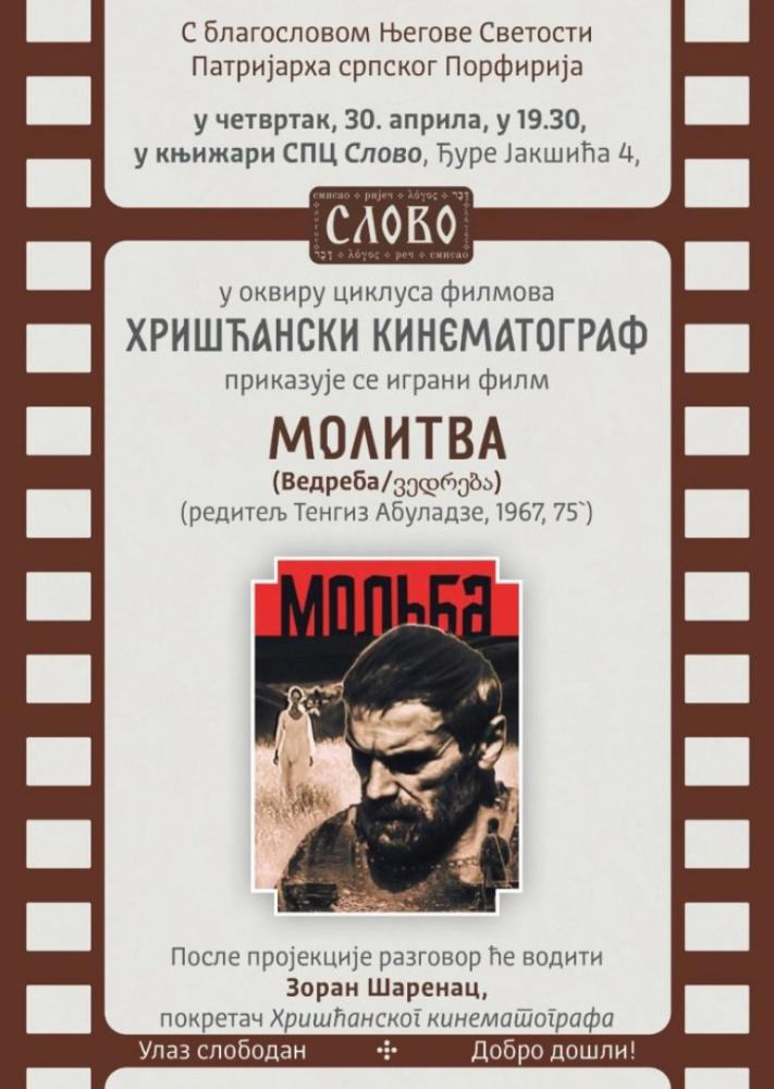 Циклус филмова Хришћански кинематограф у црквеној књижари Слово се наставља у четвртак, 30. априла 2026. године. У 19,30 часова на програму је филм Молитва грузијског редитеља Тенгиза Абуладзеа из 1967. године.
