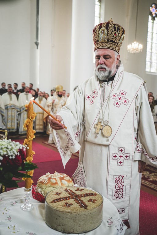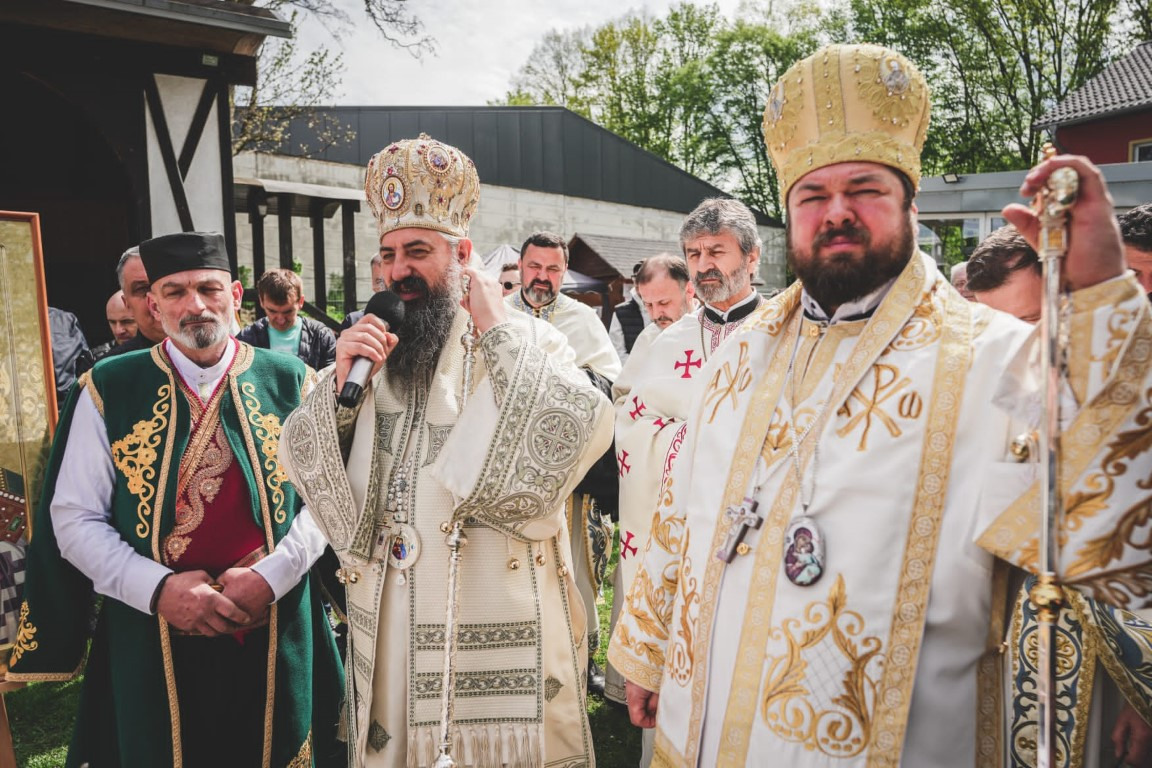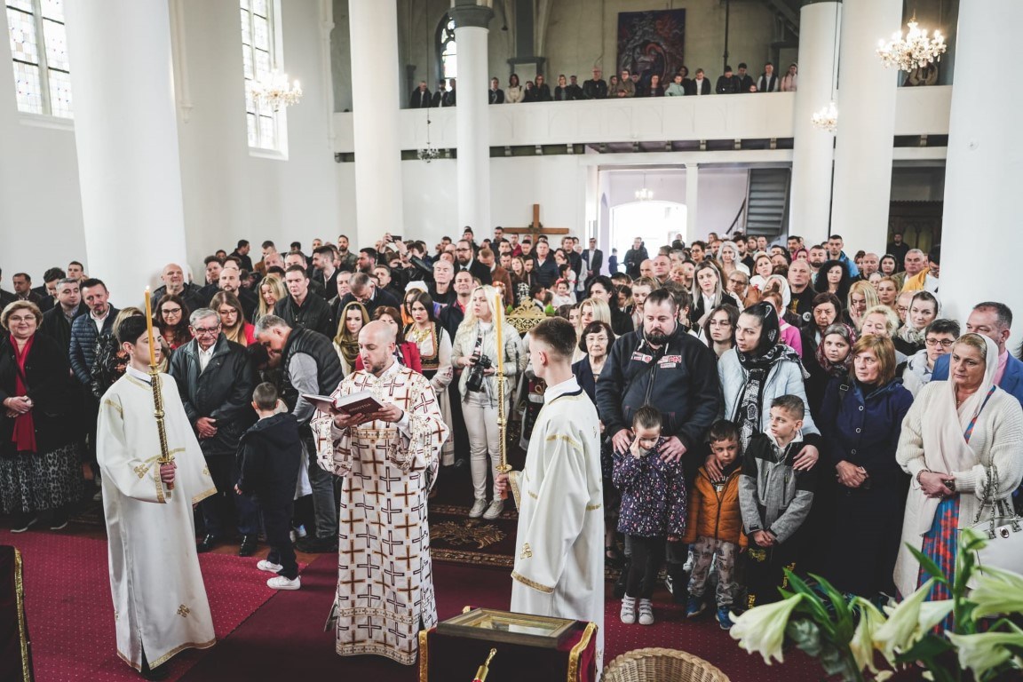 Зато је данас велика слава, велика част и ми смо вам захвални неизмјерно што сте послушали наш позив и дошли у овај свети храм у коме се свештеник отац Данило са својим сарадницима, са предсједником Црквеног одбора, са свим вјерницима труди да направи оно што је владика Николај правио читавог свога живота, да направи мјесто свијетло и мјесто свето, да направи заједницу, па када прође неко овуда, када угледа овај храм и порту, да каже овдје живе православни Срби и они браћа и сестре, јер су они заједница људи. Да људи виде и кажу како се овдје неки људи моле Богу, како неки људи овдје поштују Бога, а нико, вјерујте ми, браћо и сестре, никада неће презрети некога ко поштује Бога, нико паметан, нико честит, само ће они у које је ушла злоба мрзјети и завидјети, али на нама је да се и за њих молимо и иштемо милост Божју. Нама је дата заповјест, браћо и сестре, да волимо и оне који нас не воле, да волимо и оне који нас мрзе, то је највећа заповјест. Владика Николај у једној својој молитви, написаној на Охридском језеру, каже: Благослови Господе непријатеље моје, и ја их благосиљам и не кунем, непријатељи су ме више гурали теби у наручје него пријатељи. Како је мудар и паметан човјек био тај наш заштитник и учитељ. Тако и ову заједницу они који јој непријатељствују, све више и више гурају у наручје Божје и зато ова заједница треба да се моли и за њих, који је гурају у наручје Божје и ми тако треба да чинимо. То треба да научимо од Светог Николаја, да научимо да загрлимо и онога са Запада и онога са Истока и онога са Сјевера и онога са Југа. Ко неће да загрли другога човјека онда нема удјела са Христом, јер је то жртва љубави која се од нас очекује. Нема тога већег Србина у нашем народу од Николаја, па када је он то чинио, онда то треба да чини свако ко хоће да буде паметан. Нека би Бог данас дао да његовим светим молитвама будемо просвећени, да будемо освећени, да будемо испуњени том истином да је Јеванђеље љубав и да Јеванђеље морамо ширити као што га је он ширио, трпећи ударце од других, од својих, од најближих, али непрестано и непрестано само једно говорећи да је Бог љубав, да је Христос Живот и да је Живот побједио и да Живот животује. Да Бог тако и нас данас дарује да прихватимо живот и када изађемо из овог храма да проповједамо живот, мир и спасење. Амин, Боже дај! Христос Воскресе!