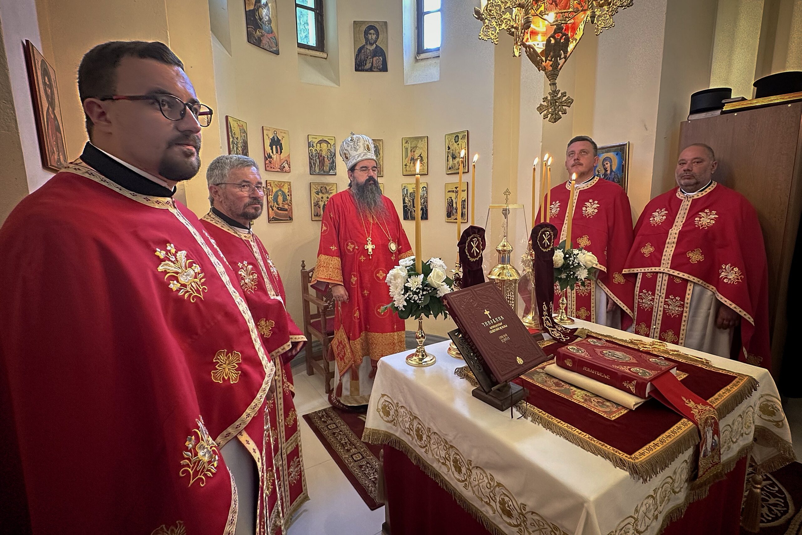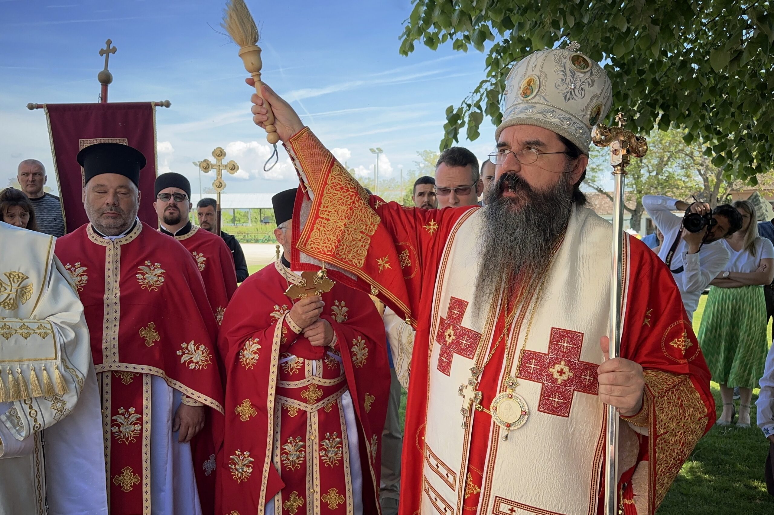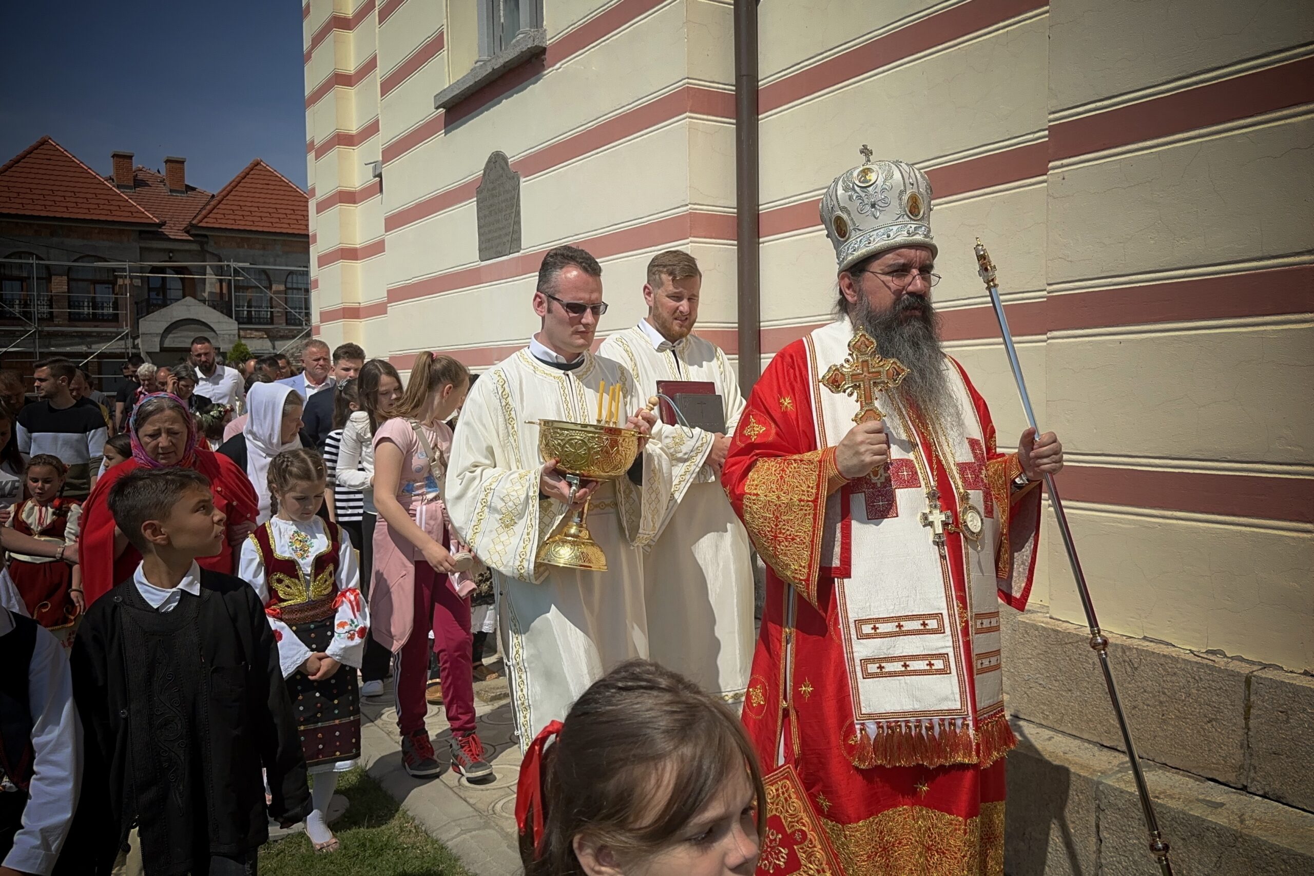 - Господ нам говори у Светом Писму: цару царево, Богу Божје. Свети Георгије је прихватајући речи Господње то и урадио: као војник цару је дао царево, али када је цар тражио оно што није његово, Свети Георгије се успротивио и рекао да не може да тражи оно што припада Једином Богу. Свети Георгије је страдао због Јеванђеља, хришћана и свих људи који верују у хришћанске непролазне вредности. Он је својим страдањем великомученик, али је и победоносац, јер је сведочио Христа Бога Победитеља и Цркву која траје до данас, као што и молитвени спомен на Светог Георгија траје до данашњих дана. Свети Георгије је пример и путоказ како треба да устајемо и да се боримо у животу, чак и кад нас неке велике и тешке недаће снађу не треба да паднемо у безнађе и очајање, него треба да храбро, попут Светог Георгија да се боримо са мукама и трагедијама које су нас снашле. Страдањем и погубљем није умро, него живи, али не само кроз обично сећање, него живи у наручју Бога Аврамова, Бога Свете Тројице, Оца, Сина и Светога Духа, одакле се заступа за нас и ми толике векове осећамо његове молитве и благослове - беседио је владика Јеротеј.Након свете Литургије, Преосвећени Епископ је предводио троструки опход око храма и освештао звоно за храм.