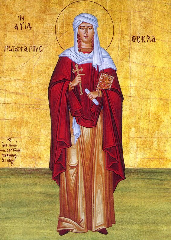У то време живљаше у Иконији веома лепа осамнаестогодишња девојка Текла, кћи Теоклије, из рода чувеног и славног. Она беше верена за једног од најугледнијих младића у граду, Фамира, веома богатог и лепог. Видећи чудеса која апостоли чињаху, Текла заједно са другама слушаше беседу њихову у дому Онисифорову крај прозора, ревносно пазећи на речи њихове. Семе речи Божје паде на добру земљу, и дејством Светога Духа оно се дубоко укорени у Теклином срцу и ниче: јер она поверова у Сина Божјег, и заволе Га и свом душом прилепи се уз Њега. А Павле, руковођен Богом, стаде говорити о девствености и целомудрију, наглашујући да девојка која чува девственост своју из љубави према Христу слична је анђелима и јесте невеста Христова, а Христос је њен Женик који је уводи у Своје небеске дворе. Много говорећи о томе, свети Павле побуди Теклу на чување девствености, и она тада тврдо реши у срцу свом да остави вереника свог и све сласти овога света и да служи Христу у девственој чистоти до смрти своје. И тако, мудра девојка чистотом својом постаде невеста Женика Небеског и свесрдном љубављу последова Њему. Горећи том љубављу као серафимским огњем, она се растапаше као восак, и на њој се зби реч светог цара Давида: Срце моје поста као восак, растопи се у мени (Пс. 21, 15). Усхићена беседом Павловом, Текла проведе три дана и три ноћи слушајући светог апостола, и потпуно заборави на храну и пиће и телесни одмор. Као што некада Марија, севши крај ногу Исусових, сва беше обузета мишљу о Богу (ср. Лк. 10, 39. 42), тако се и Текла храњаше само речју Његовом, јер је у Светом Писму речено: Не живи човек само о хлебу, него о свакој речи која излази из уста Божјих (Мт. 4, 4).