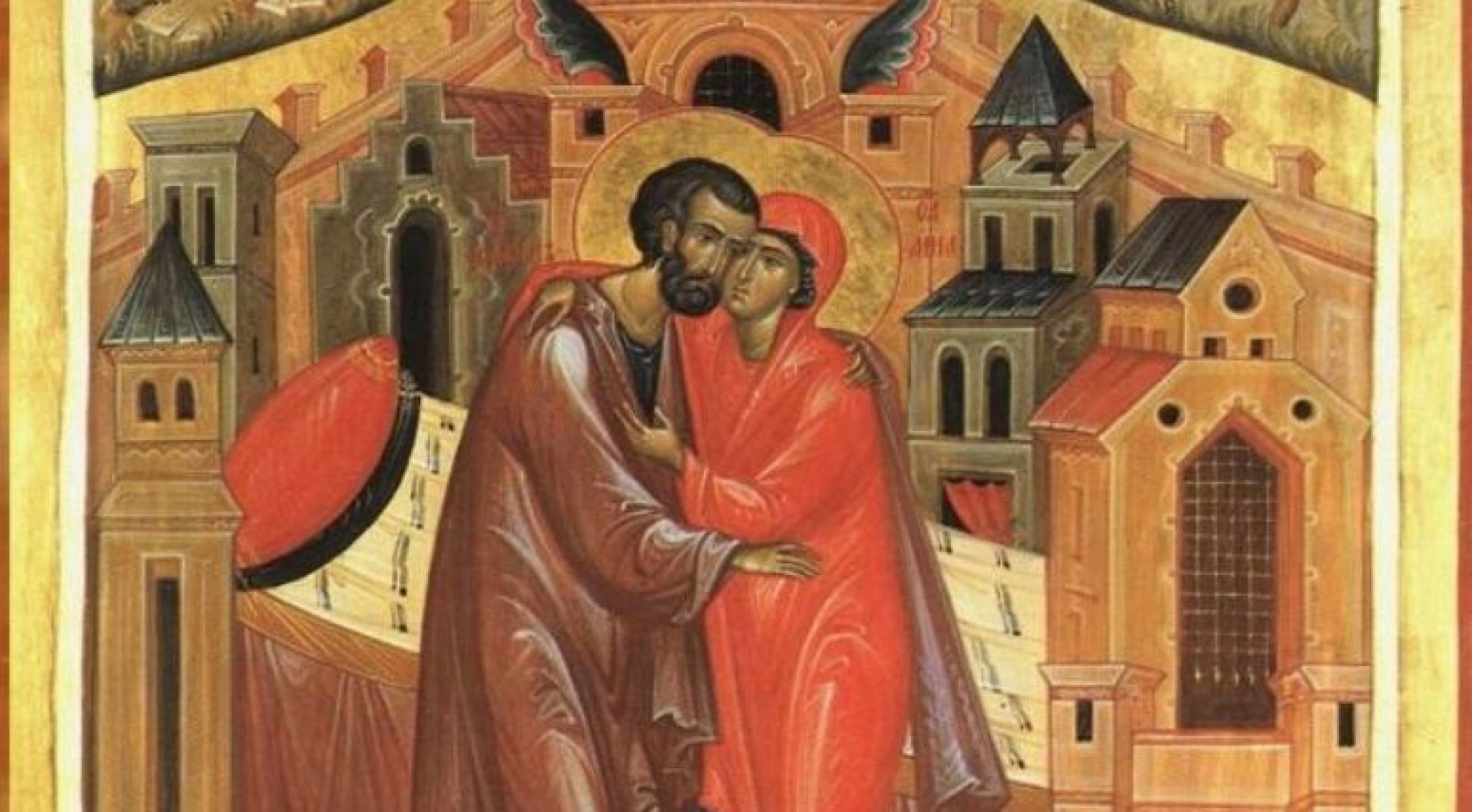 Свети Јоаким живљаше у граду Назарету Галилејском и имађаше жену Ану из колена Левијина, од рода Аронова, кћер свештеника Матана, који је живео пред царовање Ирода, сина Антипатрова. Овај свештеник Матан имађаше жену Марију, из колена Јудина, из Витлејема, и роди с њом три кћери: Марију, Совију и Ану. Марија се удаде у Витлејем, и роди Саломију: Совија се удаде такође у Витлејем, и роди Јелисавету, мајку светог Јована Претече; а Ана се удаде у Назарет за Јоакима. Ови супрузи високога рода, Јоаким и Ана, живећи по закону Господњем беху праведни пред Богом. Имајући богатство материјално, они не лишаваху себе ни богатства духовнога: они украшаваху себе сваком врлином, беспрекорно ходећи у свима заповестима Господњим. Од свих прихода својих ови побожни супрузи једну трећину само употребљаваху на себе, другу раздаваху сиромасима и трећу жртвоваху храму.