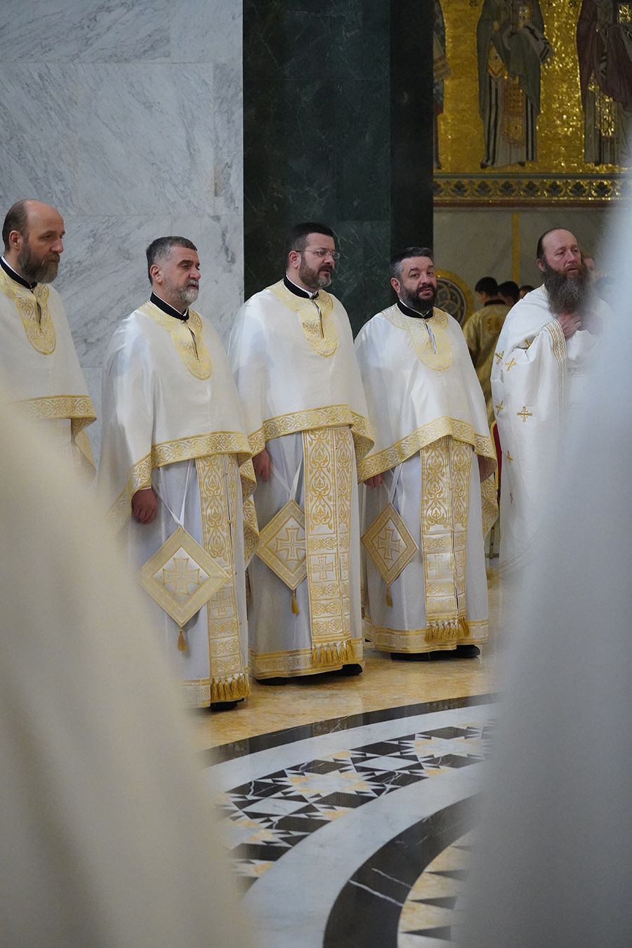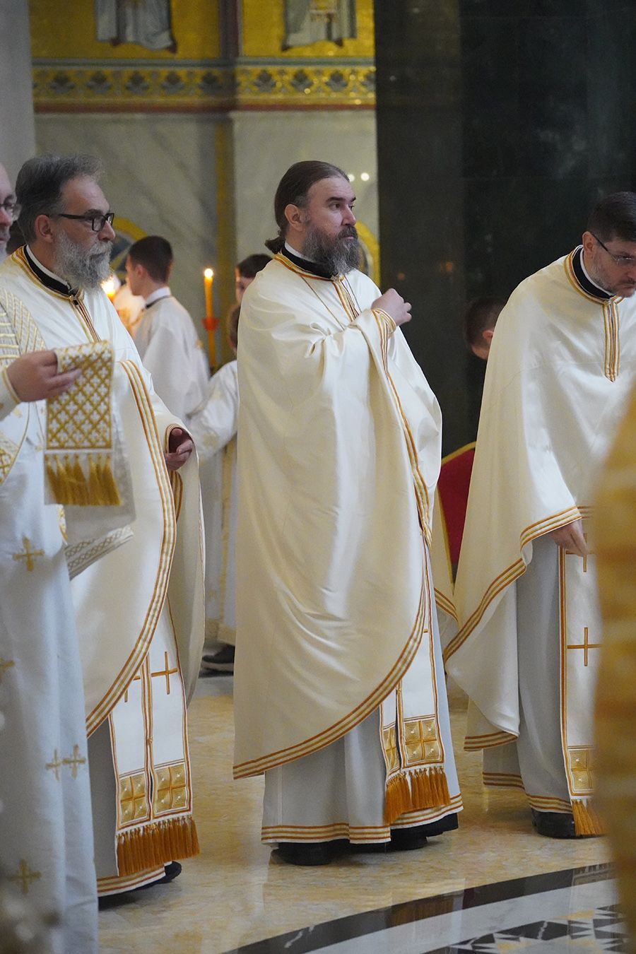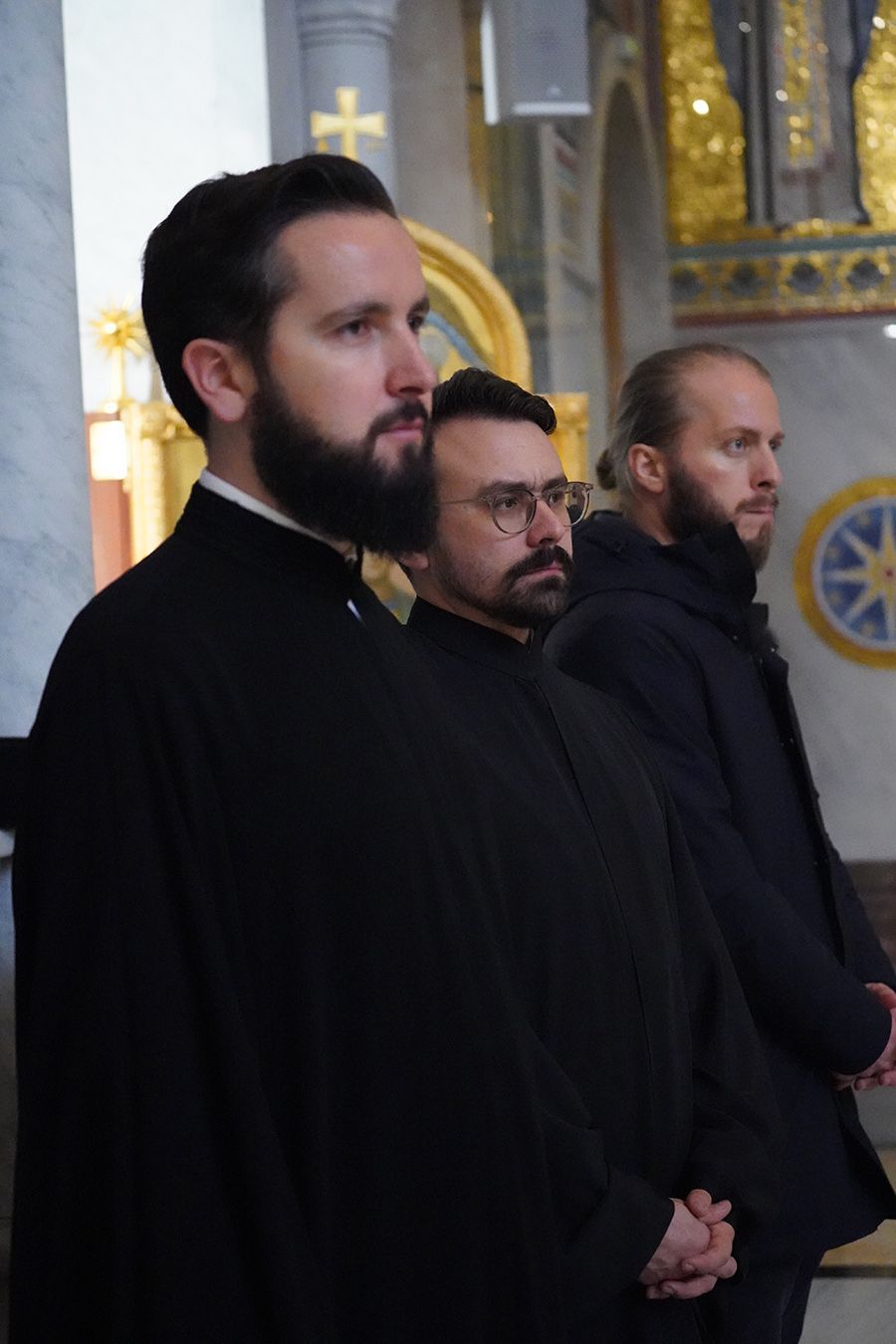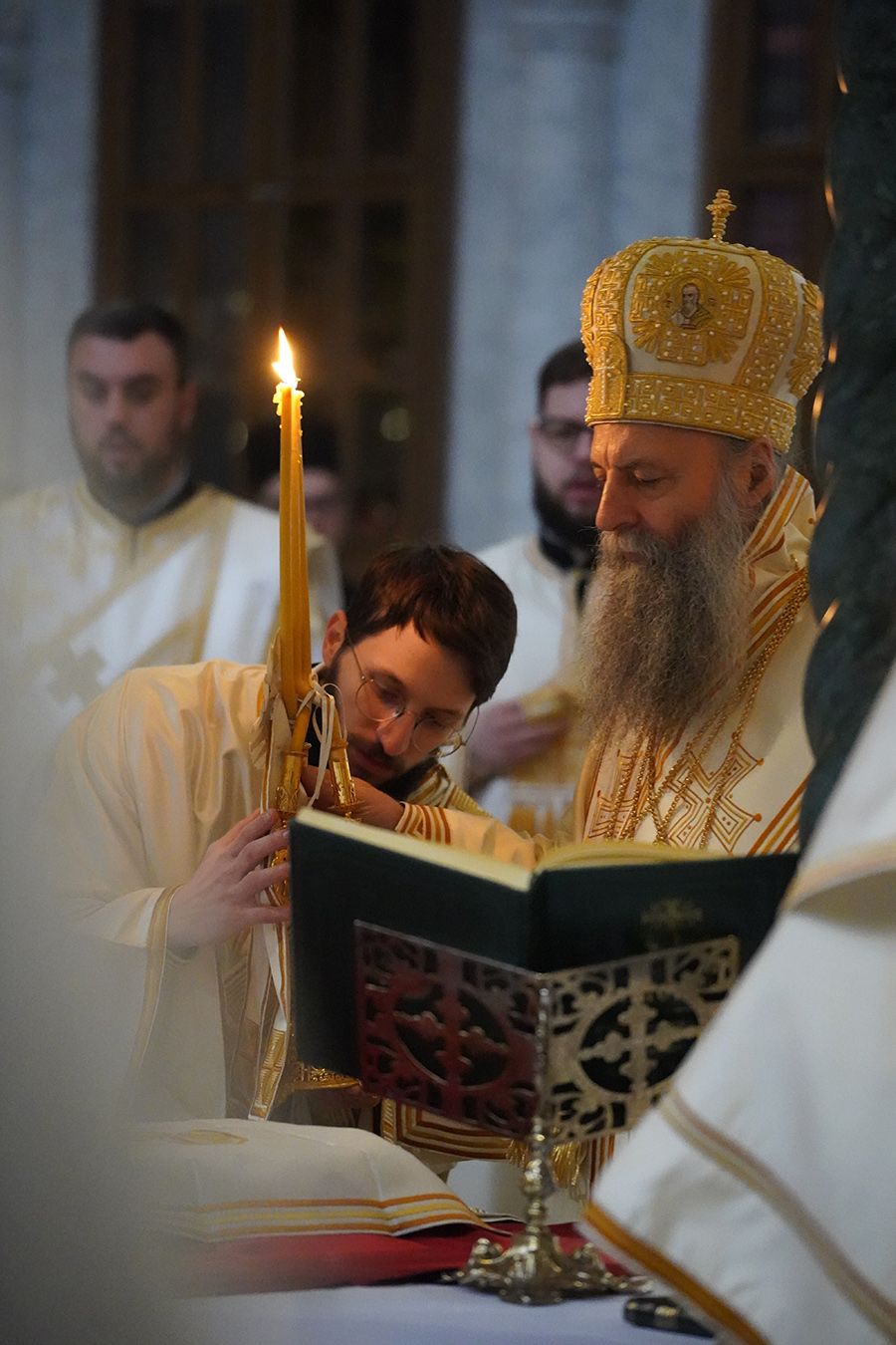 Његовој Светости Патријарху су саслуживали, поред свештеника Петра и ђакона Томе Купрјановића из Пољске Православне Цркве и свештеника и ђакона из Македонске Православне Цркве – Охридске Архиепископије, и: преосвећена господа епископи лондонски и британско-ирски Нектарије, викарни липљански Доситеј и викарни новобрдски Иларион; архимандрит Нектарије, главни секретар Светог Архијерејског Синода; архимандрит Данило, директор Патријаршијске управне канцеларије; протојереји-ставрофори Владимир Вукашиновић, Драган Станишић, Бранко Топаловић и Радивоје Панић; протојереј Ђорђе Стојисављевић, шеф Кабинета Патријарха српског; протојереј Србољуб Убипариповић, декан Православног богословског факултета у Београду; протојереј Борис Савић; протонамесник Богољуб Остојић; протојереј-ставрофор Виталије Тарасјев, настојатељ Подворја Московске Патријаршије; протојереји-ставрофори Панајотис Каратасиос и Димитрије Касапис; протојереји Ненад Јовановић, Драган Шовљански, Иван Штрбачки, Горан Мишановић и Бранислав Кличковић; протонамесник Бориша Шањић; јереји Владан Таталовић, Далибор Стојадиновић, Бранислав Кеџић, Немања Калем и Мирослав Васић; протођакони Драган Радић, Радомир Врућинић и Младен Ковачевић; ђакони Верољуб Сандо, Василије Перић и Никола Рашковић.