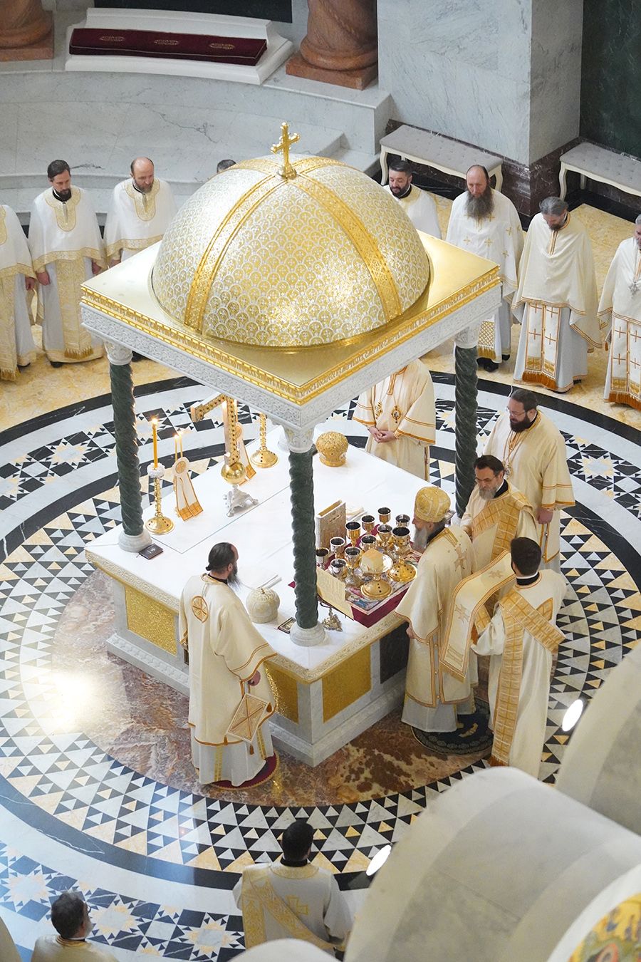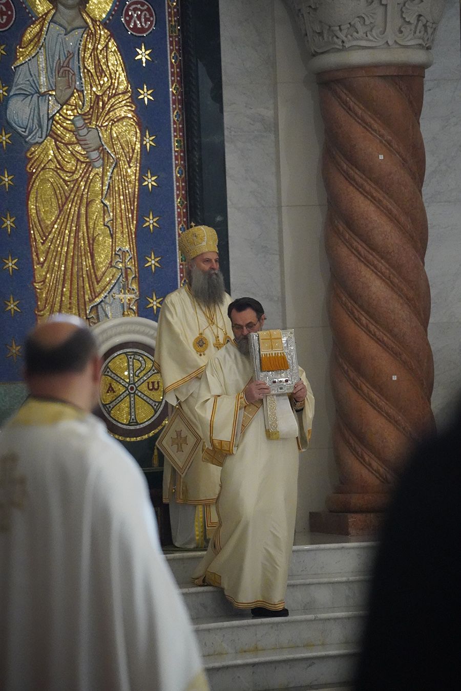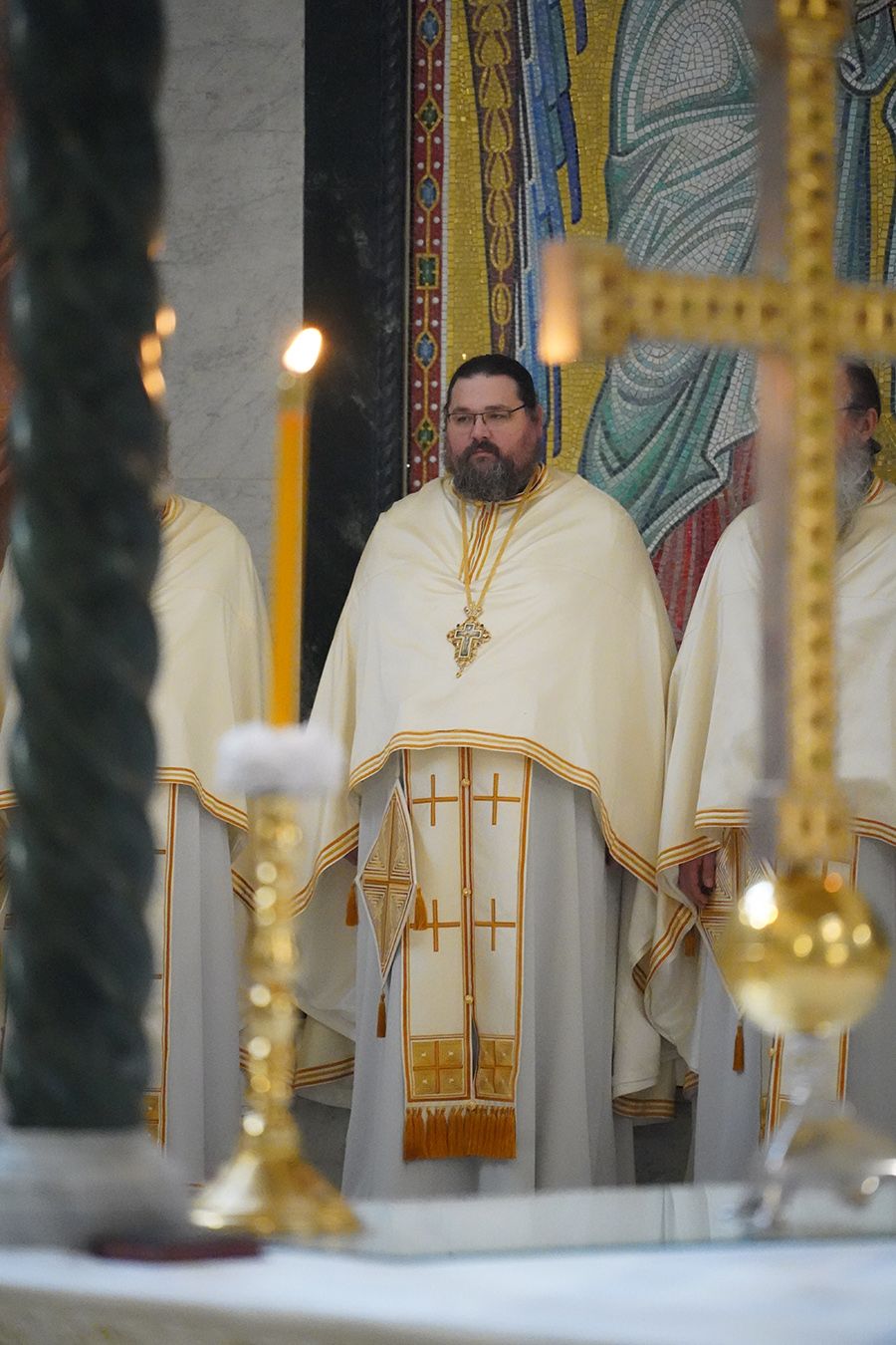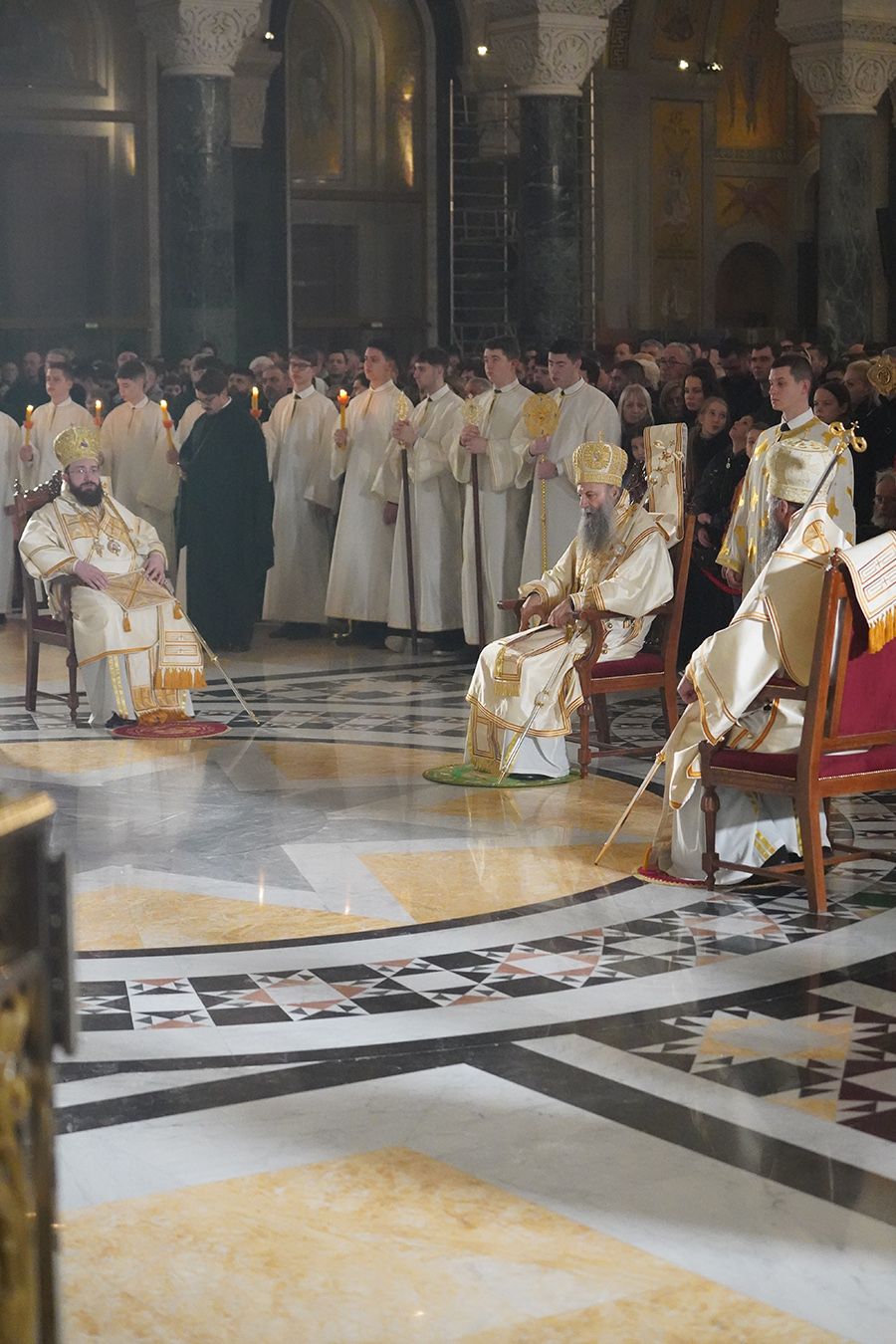 Његовој Светости Патријарху су саслуживали, поред свештеника Петра и ђакона Томе Купрјановића из Пољске Православне Цркве и свештеника и ђакона из Македонске Православне Цркве – Охридске Архиепископије, и: преосвећена господа епископи лондонски и британско-ирски Нектарије, викарни липљански Доситеј и викарни новобрдски Иларион; архимандрит Нектарије, главни секретар Светог Архијерејског Синода; архимандрит Данило, директор Патријаршијске управне канцеларије; протојереји-ставрофори Владимир Вукашиновић, Драган Станишић, Бранко Топаловић и Радивоје Панић; протојереј Ђорђе Стојисављевић, шеф Кабинета Патријарха српског; протојереј Србољуб Убипариповић, декан Православног богословског факултета у Београду; протојереј Борис Савић; протонамесник Богољуб Остојић; протојереј-ставрофор Виталије Тарасјев, настојатељ Подворја Московске Патријаршије; протојереји-ставрофори Панајотис Каратасиос и Димитрије Касапис; протојереји Ненад Јовановић, Драган Шовљански, Иван Штрбачки, Горан Мишановић и Бранислав Кличковић; протонамесник Бориша Шањић; јереји Владан Таталовић, Далибор Стојадиновић, Бранислав Кеџић, Немања Калем и Мирослав Васић; протођакони Драган Радић, Радомир Врућинић и Младен Ковачевић; ђакони Верољуб Сандо, Василије Перић и Никола Рашковић.
