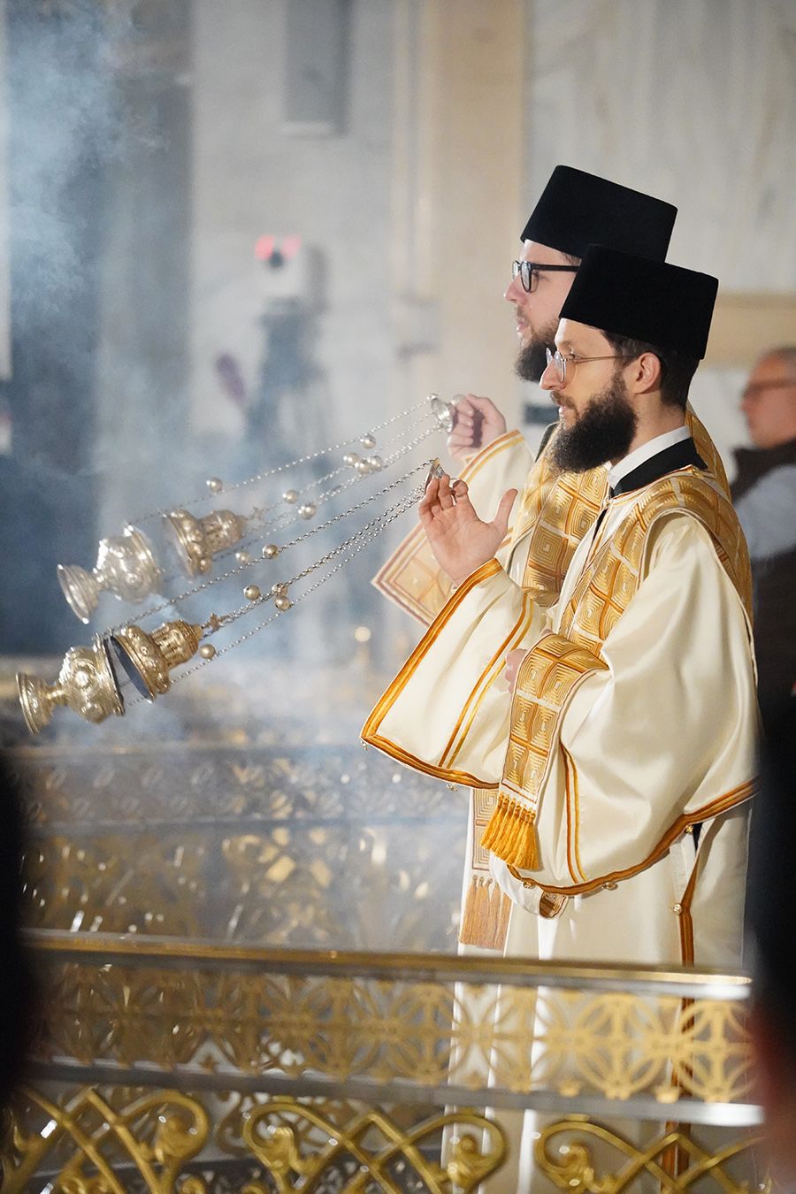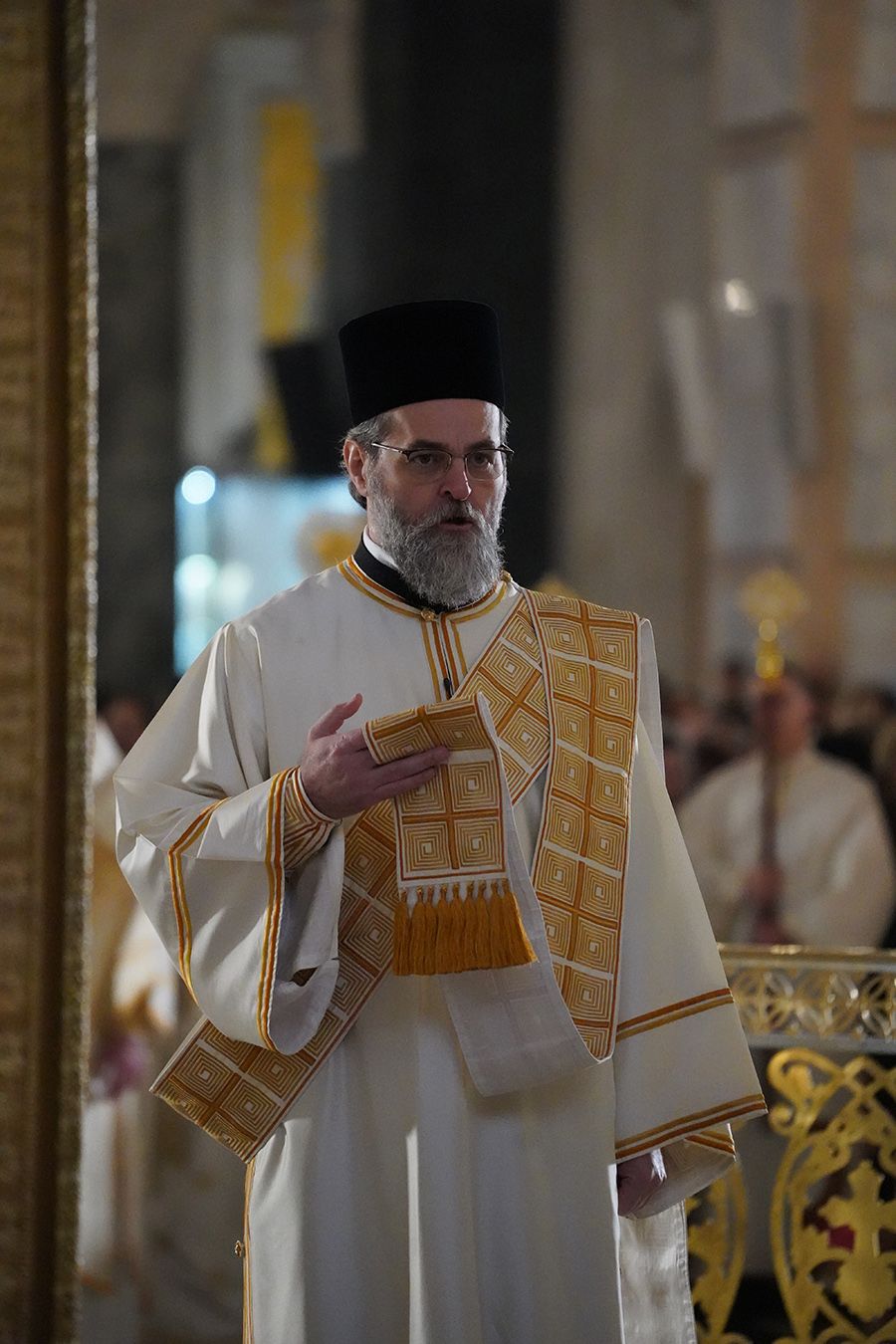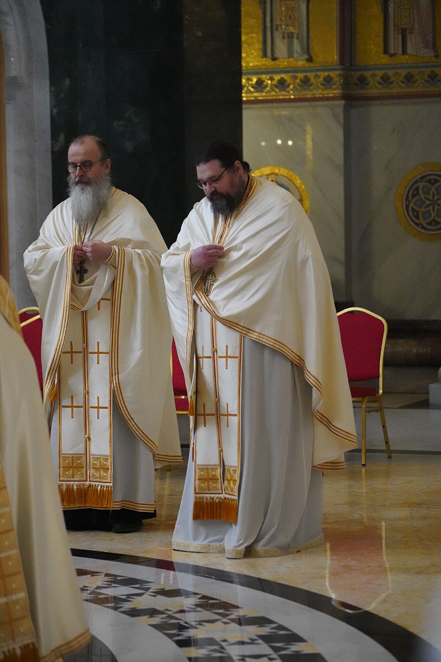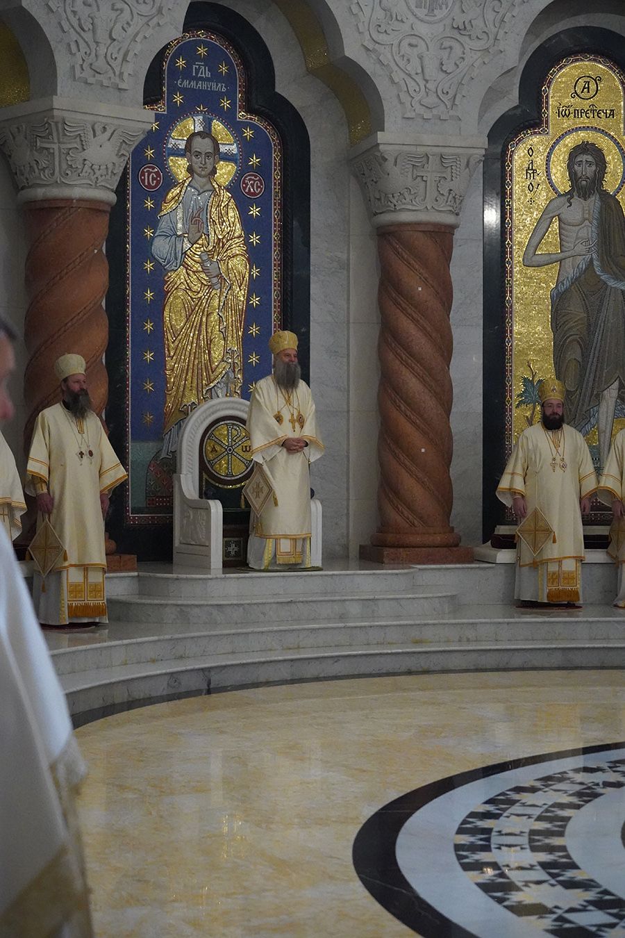 Његовој Светости Патријарху су саслуживали, поред свештеника Петра и ђакона Томе Купрјановића из Пољске Православне Цркве и свештеника и ђакона из Македонске Православне Цркве – Охридске Архиепископије, и: преосвећена господа епископи лондонски и британско-ирски Нектарије, викарни липљански Доситеј и викарни новобрдски Иларион; архимандрит Нектарије, главни секретар Светог Архијерејског Синода; архимандрит Данило, директор Патријаршијске управне канцеларије; протојереји-ставрофори Владимир Вукашиновић, Драган Станишић, Бранко Топаловић и Радивоје Панић; протојереј Ђорђе Стојисављевић, шеф Кабинета Патријарха српског; протојереј Србољуб Убипариповић, декан Православног богословског факултета у Београду; протојереј Борис Савић; протонамесник Богољуб Остојић; протојереј-ставрофор Виталије Тарасјев, настојатељ Подворја Московске Патријаршије; протојереји-ставрофори Панајотис Каратасиос и Димитрије Касапис; протојереји Ненад Јовановић, Драган Шовљански, Иван Штрбачки, Горан Мишановић и Бранислав Кличковић; протонамесник Бориша Шањић; јереји Владан Таталовић, Далибор Стојадиновић, Бранислав Кеџић, Немања Калем и Мирослав Васић; протођакони Драган Радић, Радомир Врућинић и Младен Ковачевић; ђакони Верољуб Сандо, Василије Перић и Никола Рашковић.