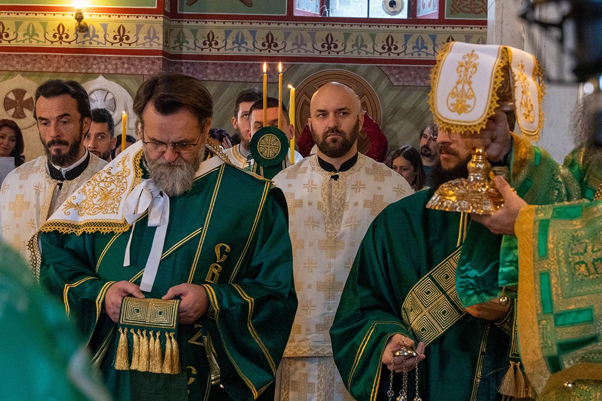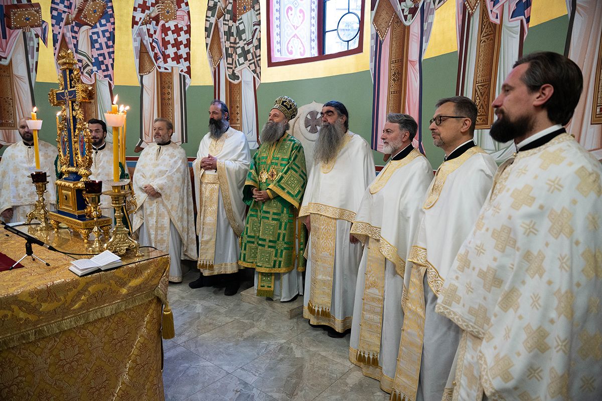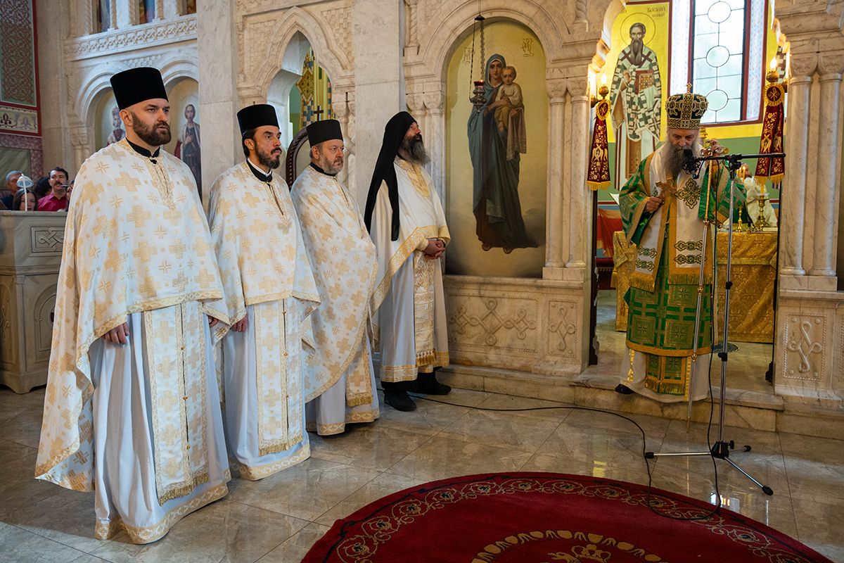 Предстојатељу Српске Православне Цркве су саслуживали: игуман Рафаило, јеромонах Марко и јерођакон Калистрат из манастира Подмаине; протонамесник Стеван Вукић, старешина храма; протојереји Јован Гардовић и Бранислав Јелић; јереји Оливер Суботић, Бранислав Кеџић и Александар Секулић; протођакони Радомир Врућинић и Драган Радић; ђакони Василије Перић и Ђорђе Петровић.
