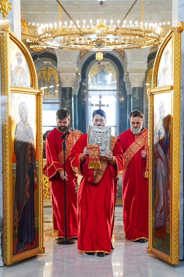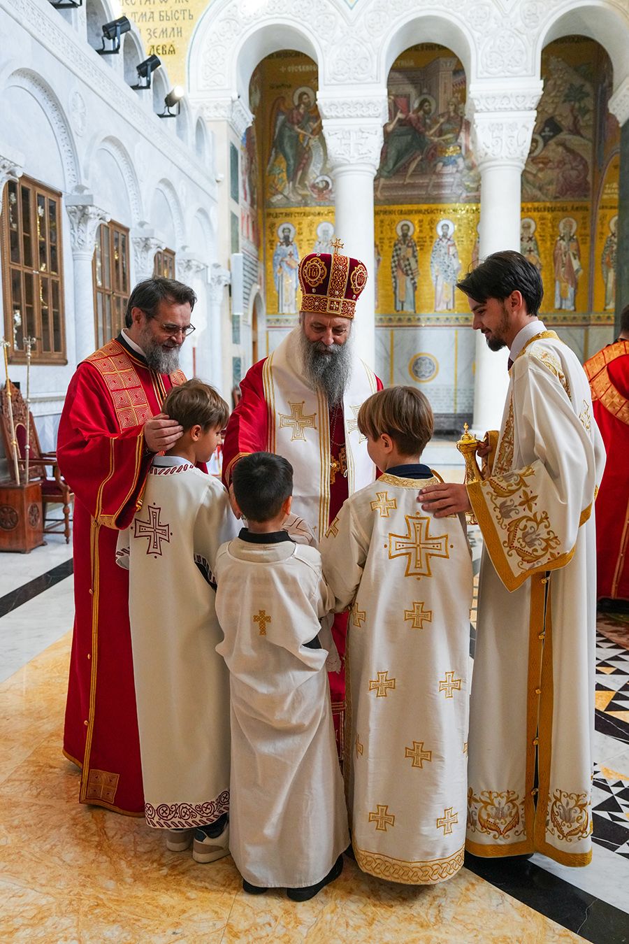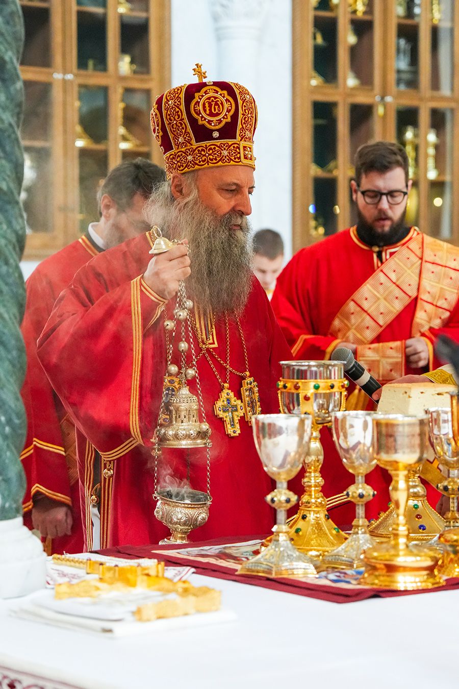 Предстојатељу Српске Православне Цркве Патријарху Порфирију су саслуживали: протојереји-ставрофори Радивоје Панић и Димитрије Касапис; протојереј Ђорђе Стојисављевић, шеф Кабинета Патријарха српског; протојереји Ненад Јовановић, Предраг Продић, Драган Шовљански и Иван Штрбачки; јеромонах Силуан; јереји Мирослав Васић и Немања Калем; протођакони Драган Радић и Радомир Врућинић; и ђакони Василије Перић, Никола Рашковић и Никола Вилотић.