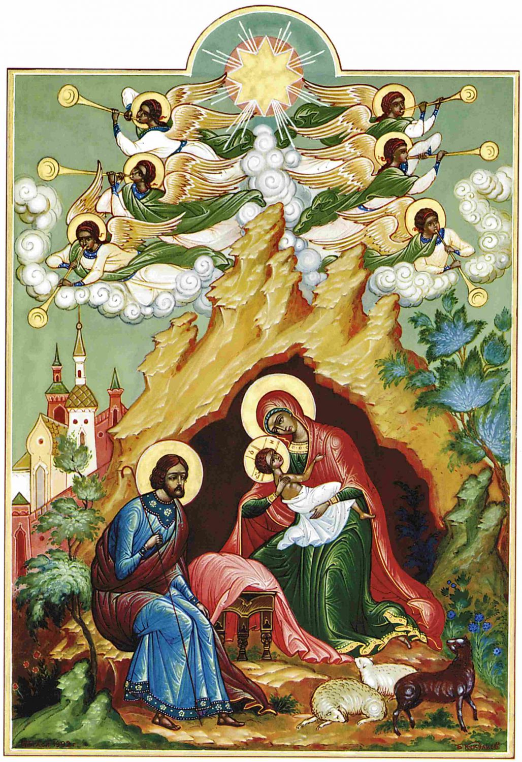 А кад се наврши време посла Бог Сина Свог Јединородног (Гал. 4, 4), да спасе род људски. И кад се испуни девет месеци од благовести, коју јави архангел Гаврил Пресветој Дјеви у Назарету говорећи: Радуј се, благодатна! … ево зачећеш и родићеш Сина (Лк. 1, 28. 31), – у то време изиђе заповест од ћесара Августа, да се попише сав народ у царевини римској. Сходно тој заповести требаше свако да иде у свој град и тамо се упише. Зато Јосиф Праведни дође с Пресветом Дјевом у Витлејем, град Давидов, јер обоје беху од царског колена Давидова. Па како се у тај малени град слеже много народа ради пописа, не могоше Јосиф и Марија наћи конака ни у једној кући, због чега се склонише у једну пећину овчар ску, где пастири овце своје затвараху. У тој пећини, а у ноћи између суботе и недеље, 25. децембра роди Пресвета Дјева Спаситеља света, Господа Исуса Христа. И родивши Га без бола, као што Га је и зачела без греха, од Духа Светога а не од човека, она Га сама пови у ланене пелене, поклони Му се као Богу, и положи Га у јасле. Потом приђе и праведни Јосиф, и он Му се поклони као божанском плоду девичанске утробе. Тада дођоше и пастири из поља, упућени од ангела Божјег, и поклонише Му се као Месији и Спаситељу. И чуше пастири мноштво ангела Божјих где поју: Слава на висини Богу и на земљи мир, међу људима добра воља (Лк. 2, 14). У то време стигоше и три мудраца с Истока вођени чудесном звездом, с даровима својим: златом, ливаном и измирном, и поклонише Му се, као Цару над царевима, и дариваше Га даровима својим (Мт. 2, 11).
