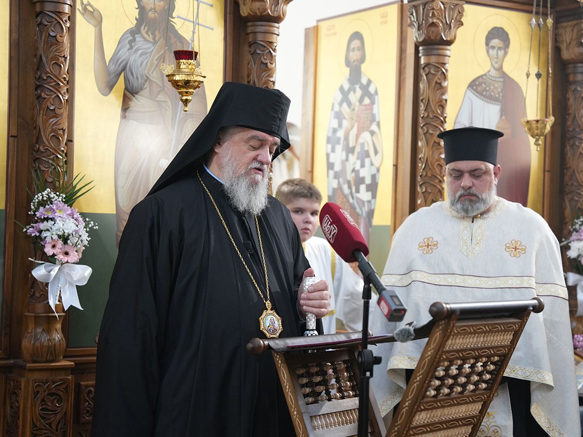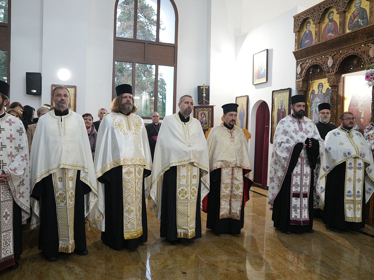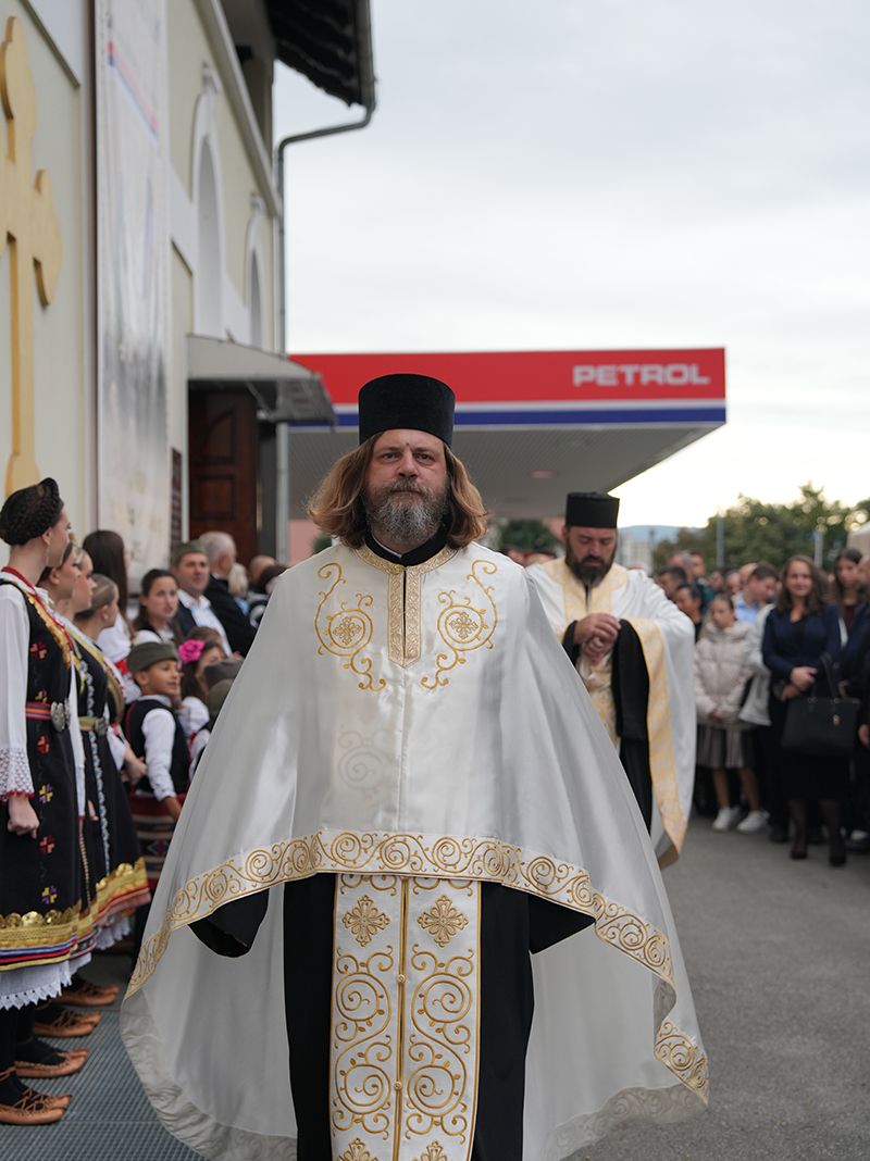– Обележени и обликовани Христом, обликовани смо Његовом заповешћу, најпре и пре свега заповешћу о љубави читавим својим бићем према Богу, али и према другим људима, као према самом себи. Ко усвоји тај принцип за темељ свог постојања тај нема проблема, зато што нема проблема са Оцем нашим, нема проблема са Богом. Љубећи Бога, све што је Божје постаје и њнаше, а Он је Творац свега што се види и не види, а изнад свега круне творевине која се зове човек. Према томе, љубећи Бога сваки човек постаје наш ближњи, независно од посебности које носи на себи, од печата који носи на себи. Посебности и различности нису дате да би биле повод за конфронтацију, за неспоразуме и, не дај Боже, за непријатељства. Посебности постоје као посебни дарови које је неко добио као појединац или као заједница да би умножавајући те дарове могли да остваре једини, највећи и најважнији дар, а то је љубав. Кроз тај дар, кроз свој посебан печат, уздарје дарујемо себе другоме, кроз тај дар упознајемо другога и волимо другога. Посебности јесу дар да бисмо кроз њих нашли пут ка Христу, али и пут једни ка другима. Нека Бог да да и сутра, служећи свету Литургију, у љубави и радости осветимо овај храм и да он буде место сусретања, нашег међусобног и свих заједно, са Богом и са свим људима добре воље. Нека сте благословени сви овде сабрани, али нека су благословени и сви људи који живе у овом дивном граду и у овој честитој, дивној и благословеној земљи Божјој сада и увек и у векове векова. Амин.