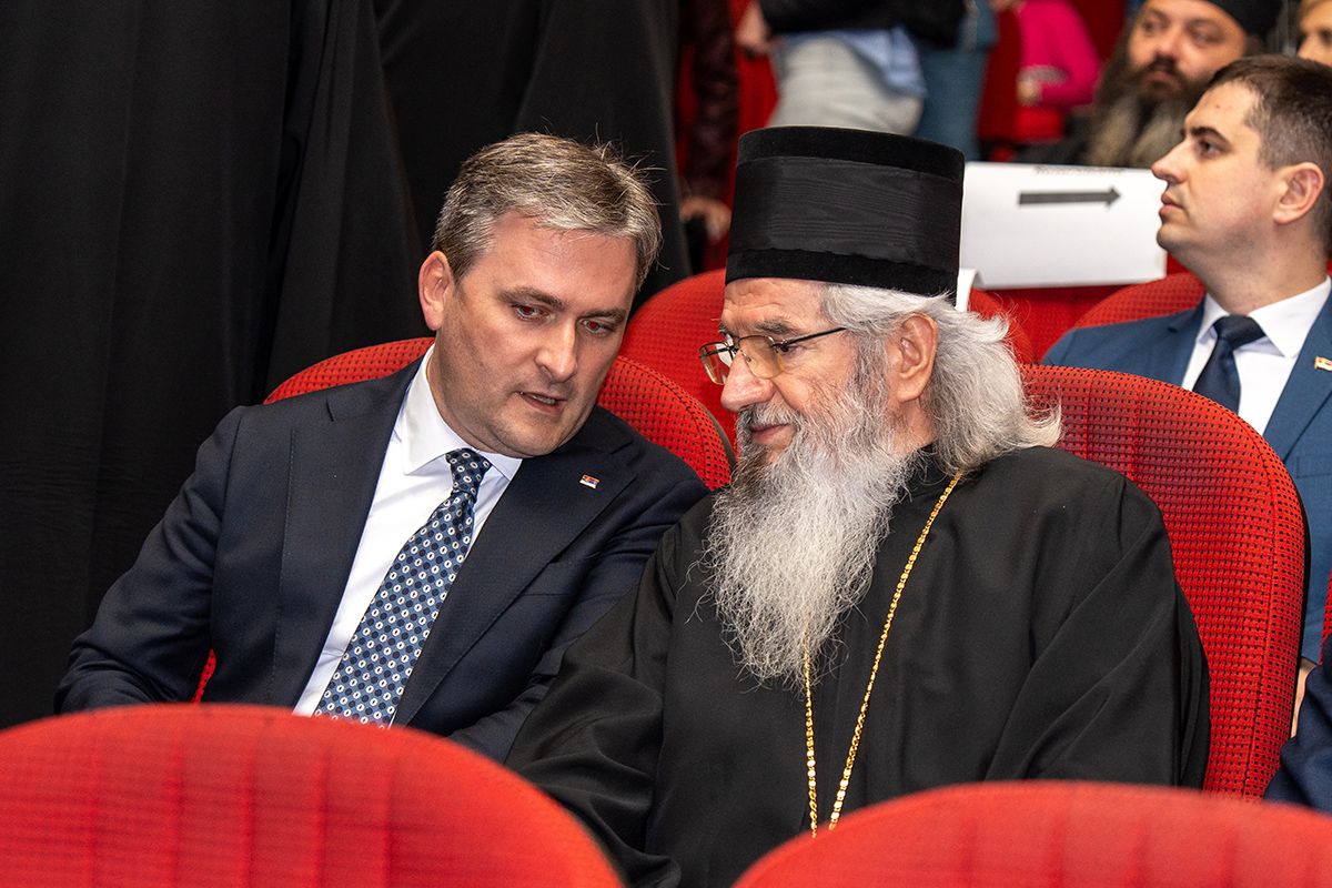 Многобројној публици и гостима - међу којима су били високопреосвећена и преосвећена господа архијереји: жички Јустин, шумадијски Јован, милешевски Атанасије, рашко-призренски Теодосије, крушевачки Давид, тимочки Иларион, нишки Арсеније, захумско-херцеговачки и стонско-приморски Димитрије, бихаћко-петровачки Сергије, ваљевски Исихије, шабачки Јеротеј и викарни мохачки Дамаскин; као и г. Дејан Вук Станковић, министар просвете; г. Драган Гламочић, министар пољопривреде, шумарства и водопривреде; г. Ненад Поповић, министар без портфеља; др Владимир Рогановић, директор Управе за сарадњу са црквама и верским заједницама - обратио се и г. Никола Селаковић, министар културе.