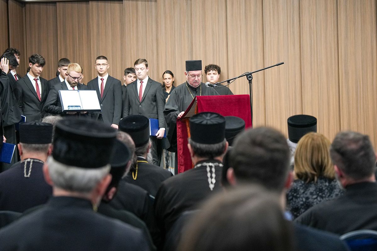 – Ваша вископреосвештенства и преосвештенства, поштовани градоначелниче, часни оци, драги професори, браћо и сестре, драги ученици Богословије Светог Јована Златоуста, желим да још једнампут са овог места честитам славу Богословије, да пожелим свако добро духовно и телесно, а изнад свега слогу, разумевање и међусобну љубав, онима који су на било који начин везани за ову Богословију, свима нама и читавом нашем народу, као и да призовем благослов Божји на ово сабрање да благодат Господа нашег Исуса Христа, и љубав Бога и Оца, и заједница Светог Духа, буде са свима вама (2Кор 13,13).
