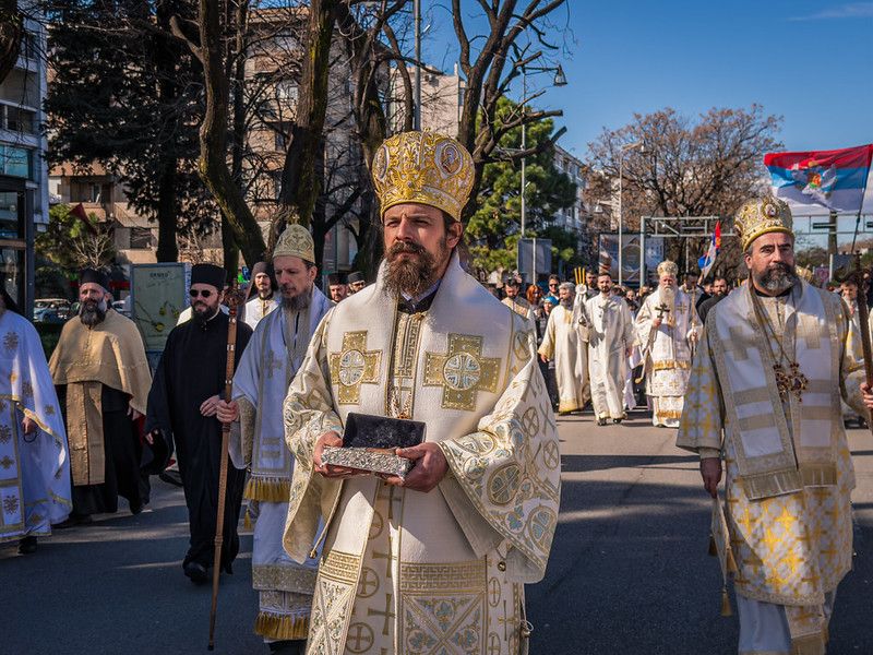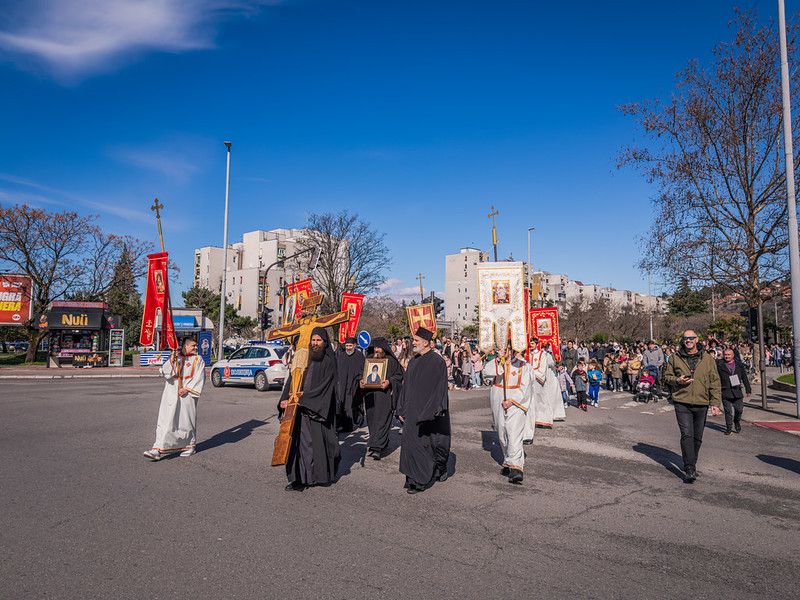 После свете Литургије, архијереји, свештенство, монаштво и више хиљада верника, родитеља и деце кренули су у традиционални крсни ход од Саборног храма до Немањиног града, где су освештани славски дарови. У обраћању на Немањином граду митрополит Јоаникије је рекао да свака литија има дубљи смисао: она је наставак оне прве литије на Цвети у Јерусалиму и символ пута ка Небеском граду, „вечном Јерусалиму који је свима нама мати“. Тај пут, нагласио је, јесте пут Христов – пут Светог Симеона и Светог Саве, Светог Василија Острошког и Светог Петра Цетињског – пут љубави, жртве и саборности. Митрополит је подсетио да се истог дана славио и празник Светог Теодора Стратилата, чији се део моштију чува у Саборном храму Христовог Васкрсења, а онда благосиљао присутни народ и град Подгорицу.