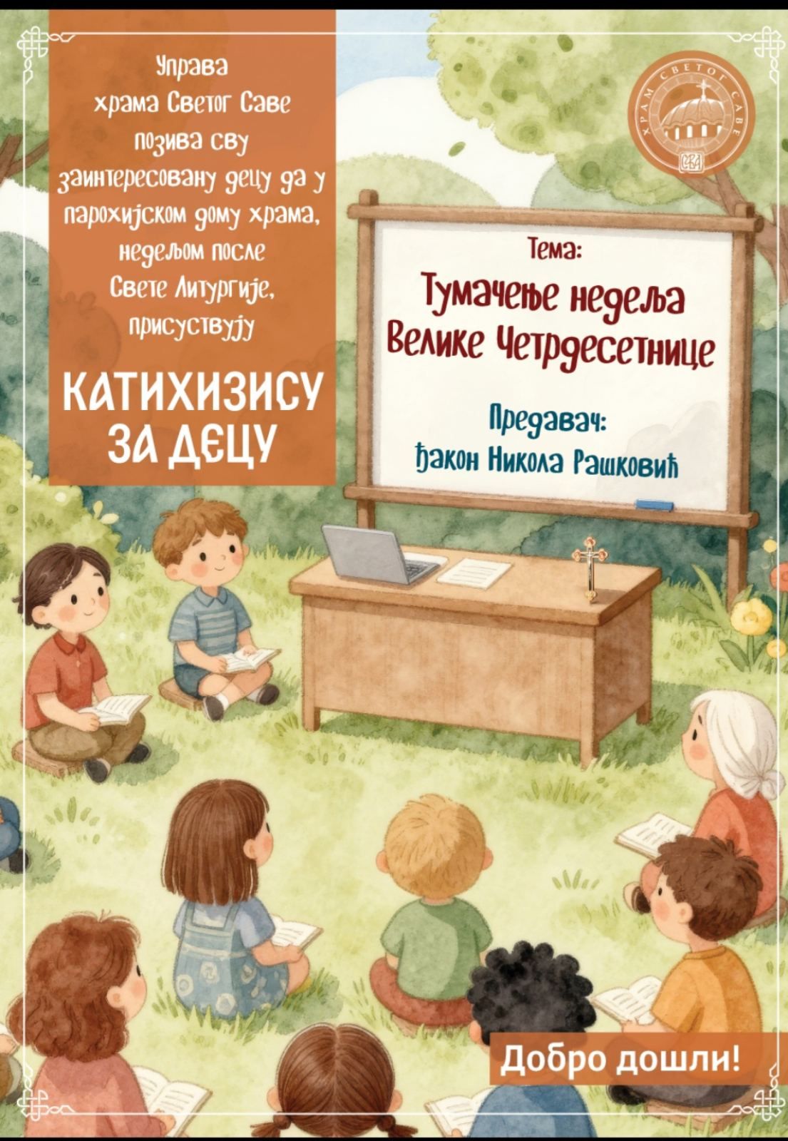 Братство храма Светог Саве са радошћу позива верни народ и сву заинтересовану децу да узму учешће у предстојећим циклусима предавања верске наставе. Ови сусрети ће се одржавати у просторијама парохијског дома са циљем упознавања са различитим темама из катихизиса и живота Цркве.