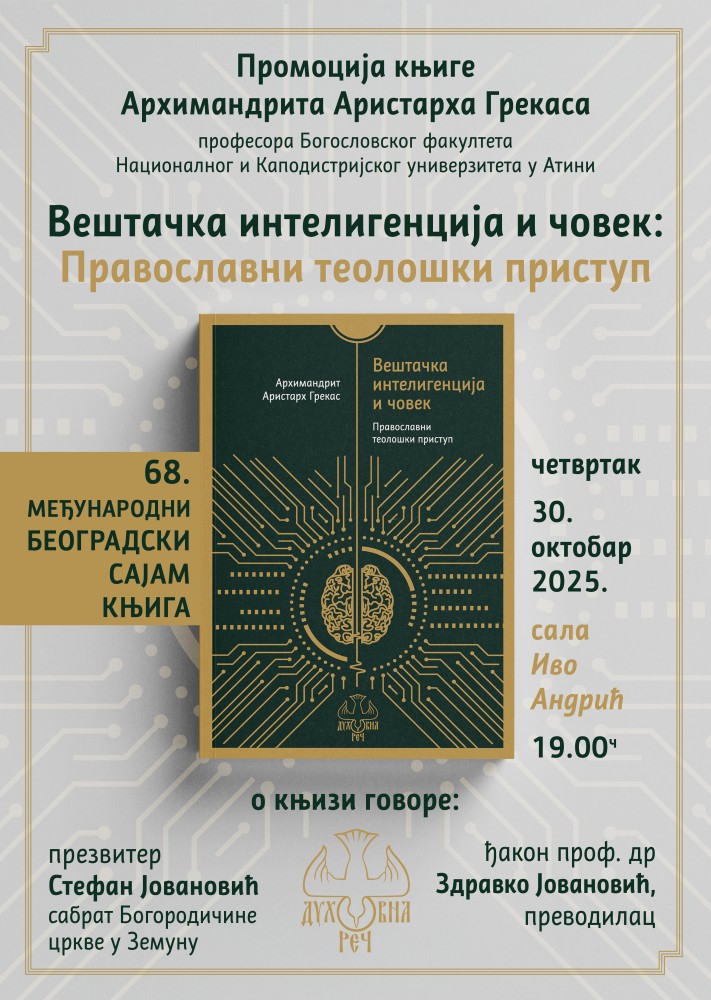 Издавачка установа Архиепископије Београдско-Карловачке „Духовна реч“ с радошћу обавештава читаоце да је светлост дана угледало ново издање — превод студије архимандрита Аристараха Грекаса, професора Богословског факултета Националног и Каподистријског универзитета у Атини, о православном односу према феномену вештачке интелигенције.