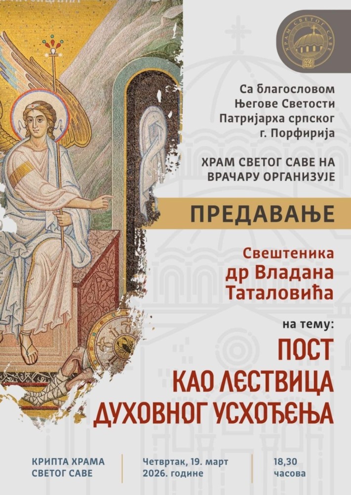 Јереј проф. др Владан Таталовић одржаће у четвртак 19. марта 2026. године са почетком у 18,30 часова у крипти храма Светог Саве на Врачару предавање на тему Пост као лествица духовног усхиођења.