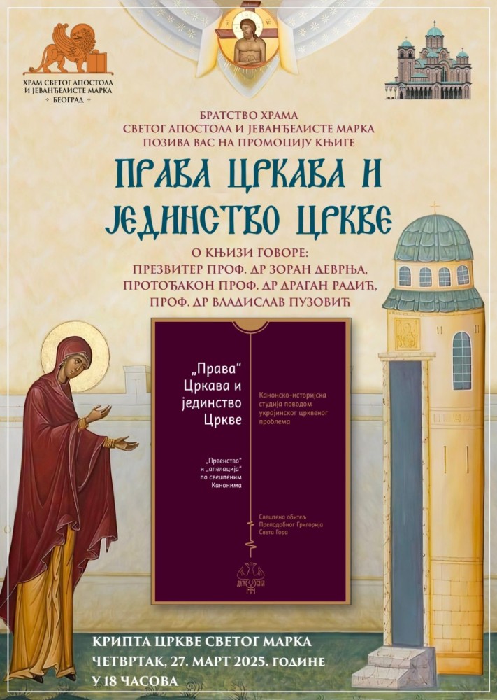 Братство храма Светог апостола и јеванђелисте Марка на Ташмајдану позива верни народ на промоцију књиге „Права Црква и јединство Цркве“.