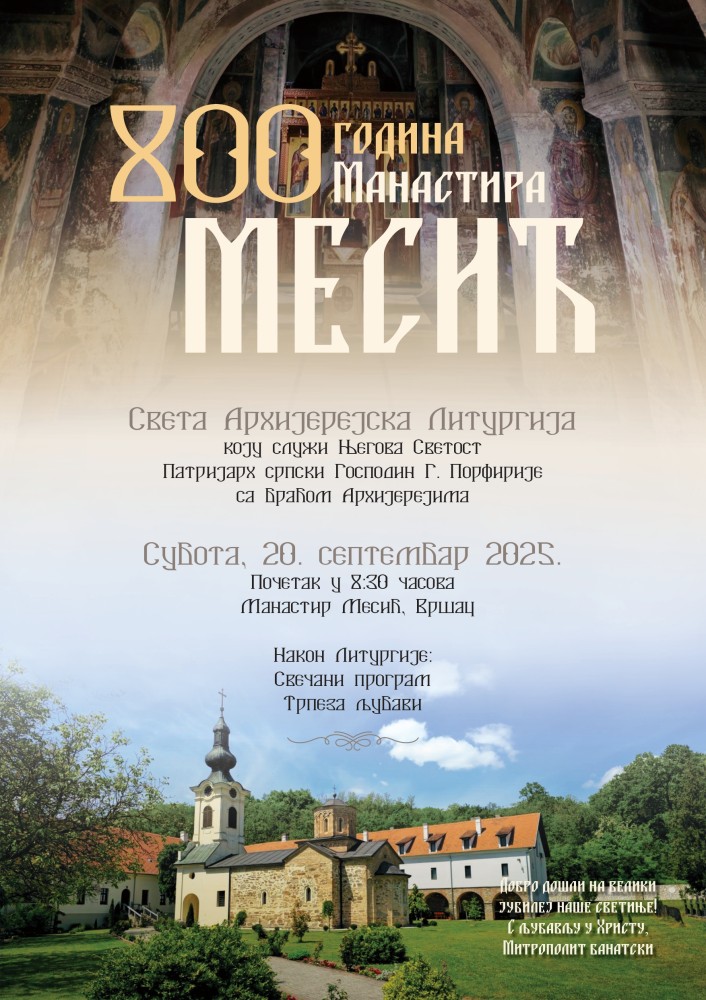Осам векова манастира Месића код Вршца биће прослављено у суботу, 20. септембра 2025. године, светом Литургијом којом ће началствовати Његова Светост Патријарх српски г. Порфирије са почетком у 8.30 часова.