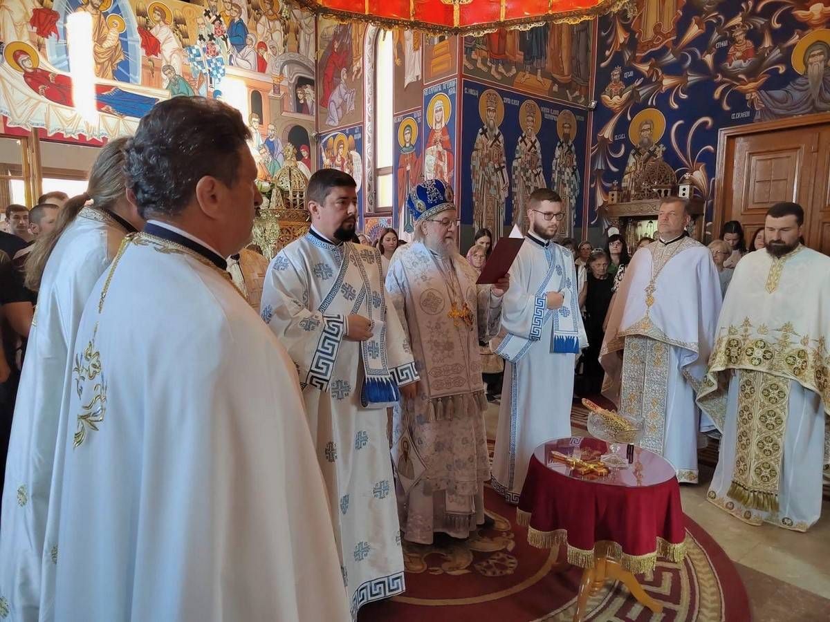 Саслуживали су: протојереј-ставрофор мр Јован Милановић, ректор Богословије Светог Арсенија Сремца; протојереј-ставрофор Зоран Јовић, архијерејски намесник старопазовачки; протојереј-ставрофор Винко Мишановић, парох румски; и протонамесник Сава Мишановић, парох новопазовачки. На почетку свете Литургије, Високопреосвећени Митрополит је извршио мало освећење храма, а у току евхаристијског славља произвео је протонамесника Саву Мишановића у чин протојереја, похваливши га због његовог труда уложеног у обнову храма и преданог рада на зидању Живе Цркве Христове и духовном уздизању повереног му стада.